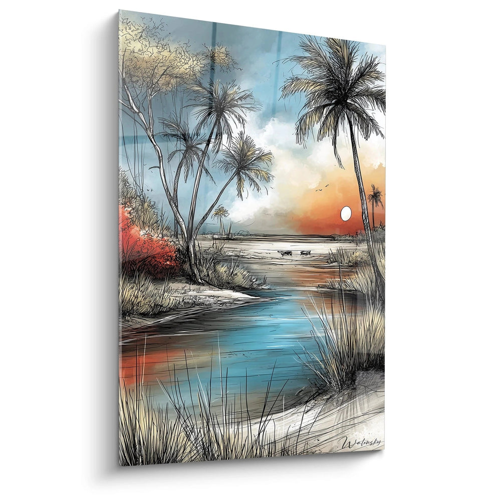 Ce tableau palmiers tropicaux captive immédiatement par sa composition harmonieuse mêlant la majesté des palmiers élancés et la sérénité d'un cours d'eau serpentant. L'œuvre révèle un tableau palmiers coucher de soleil d'une beauté saisissante, où les silhouettes gracieuses des cocotiers se détachent contre un ciel embrasé de nuances orange et turquoise. La décoration murale palmiers exotiques présente une perspective parfaitement équilibrée, avec des palmiers de différentes tailles créant une profondeur naturelle. Les reflets chatoyants sur l'eau apportent une dimension contemplative à cette scène tropicale, tandis que les détails fins des palmes révèlent un travail minutieux de l'artiste.