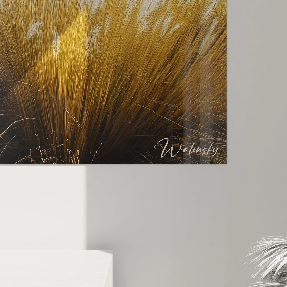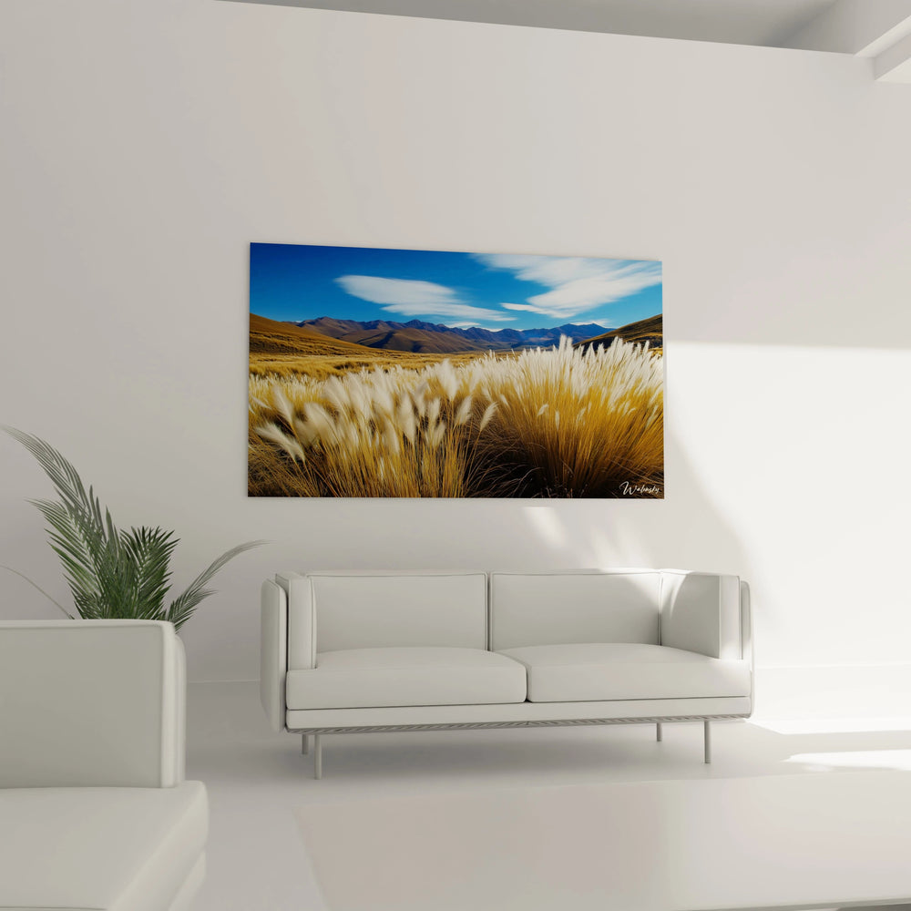Les tons chauds d’or qui caressent la végétation se marient harmonieusement avec le bleu azur du ciel, enrichissant votre intérieur d’une atmosphère raffinée et apaisante. Cette œuvre crée une ambiance vivante, où le mouvement subtil du vent semble danser au rythme de vos émotions.