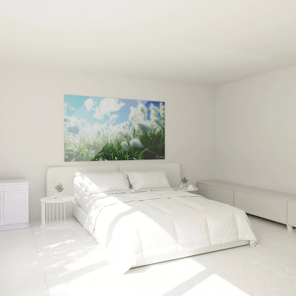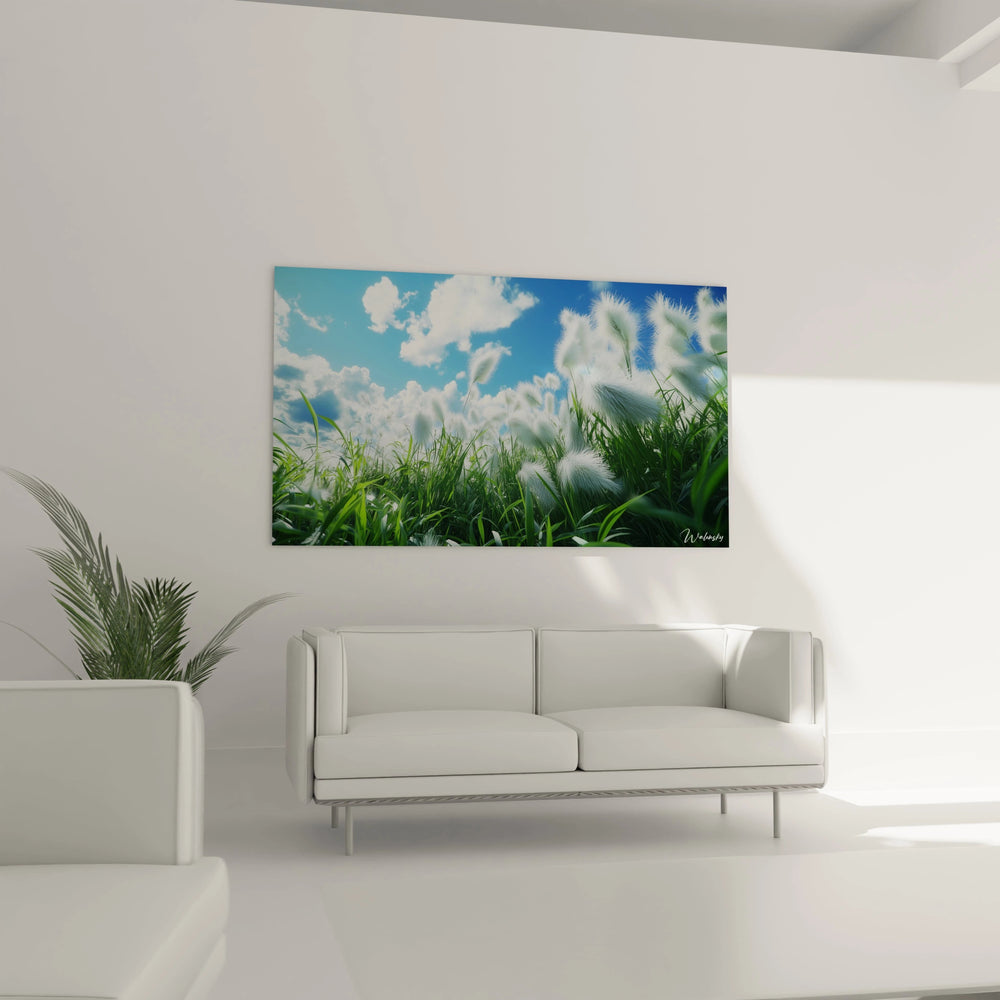 Ce tableau se distingue par sa capacitĂ© Ă immerger celui qui le contemple : la profondeur de champ, la douceur des nuances, et le contraste harmonieux entre le bleu Ă©clatant du ciel, le vert vif des pampas et le blanc soyeux des Ă©pis crĂ©ent une ambiance apaisante. Vous pouvez presque sentir la lĂ©gĂšre brise caresser votre peau et entendre le murmure du vent dans les herbes. Il apporte une bouffĂ©e dâair frais et un doux murmure de libertĂ© Ă votre espace, transformant chaque piĂšce en un havre de calme et dâĂ©quilibre.