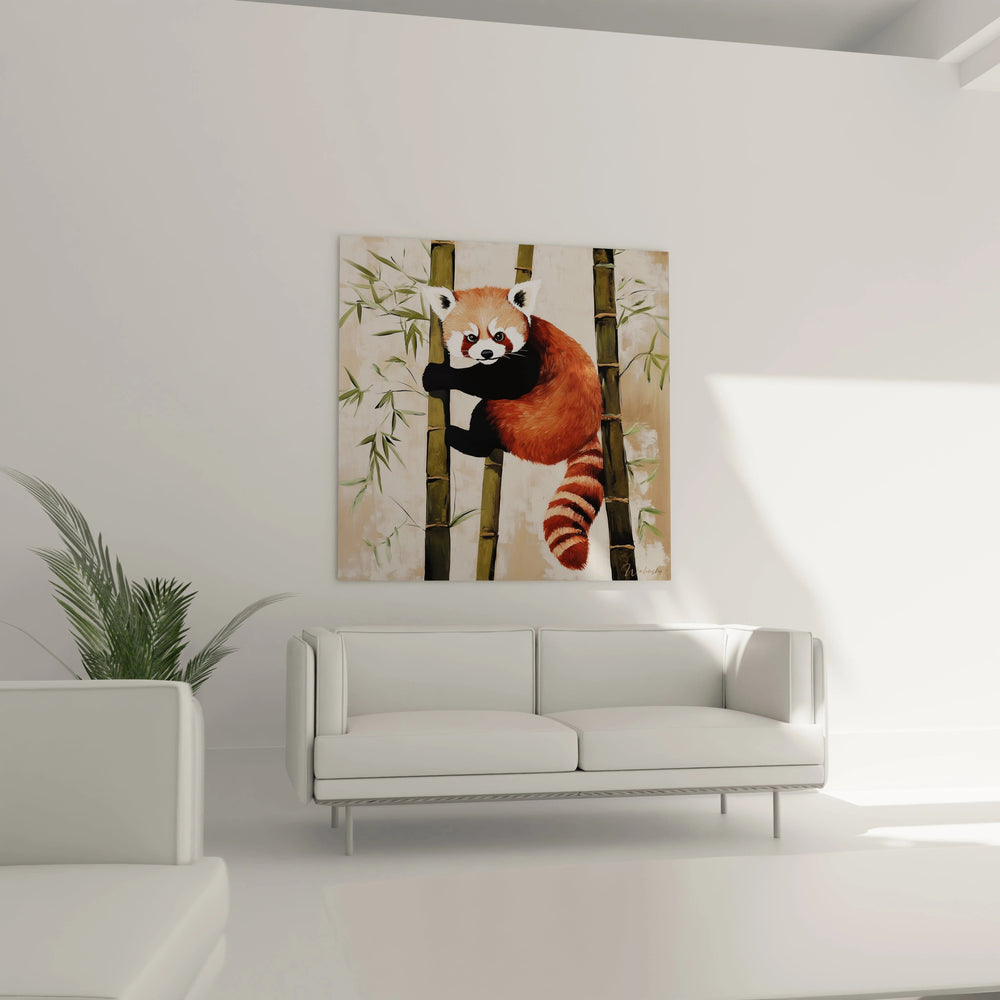 Cette œuvre panda roux se distingue par plusieurs caractéristiques visuelles uniques qui en font une pièce d'exception. L'expression faciale de l'animal, d'un réalisme saisissant, transmet une émotion palpable mêlant curiosité et sérénité. La position de l'animal, suspendu aux bambous avec une grâce naturelle, capture un moment d'équilibre parfait rarement représenté avec une telle justesse. Les proportions anatomiques respectent fidèlement la morphologie réelle de l'espèce, témoignant d'une observation précise de la nature. La signature discrète de l'artiste, visible dans l'angle inférieur droit, atteste de l'authenticité de l'œuvre. Cette décoration murale panda roux asiatique se démarque également par son approche contemporaine d'un sujet traditionnel, alliant technique classique et sensibilité moderne. Le choix artistique de placer l'animal dans un environnement épuré renforce l'impact visuel et la dimension contemplative.