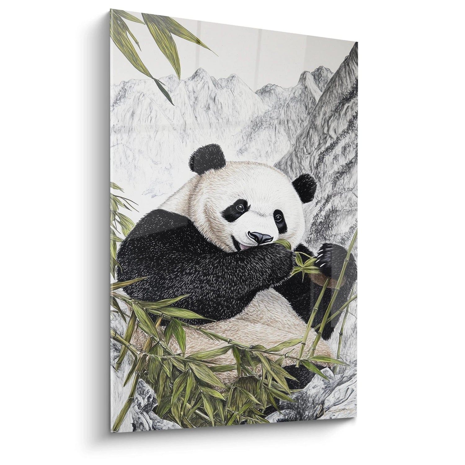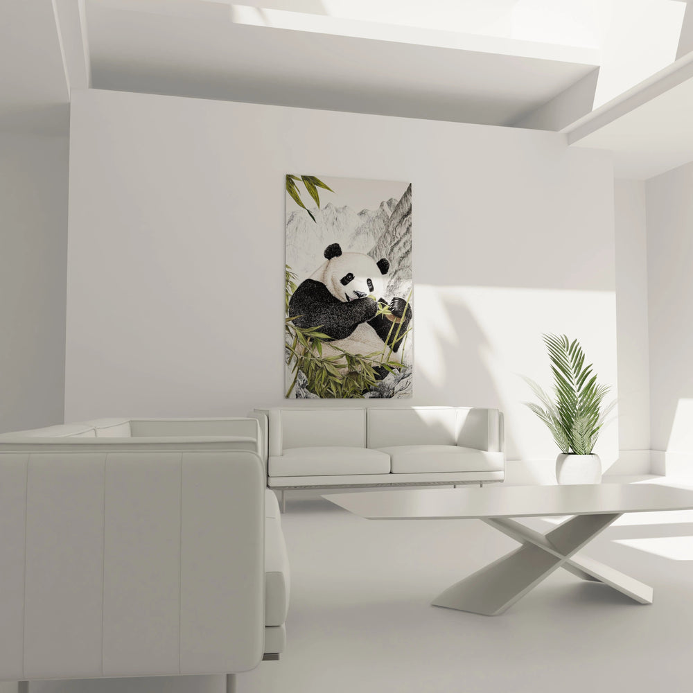 tableau panda | décoration murale panda | art mural panda réaliste | tableau panda bambou montagne | œuvre panda contemplative