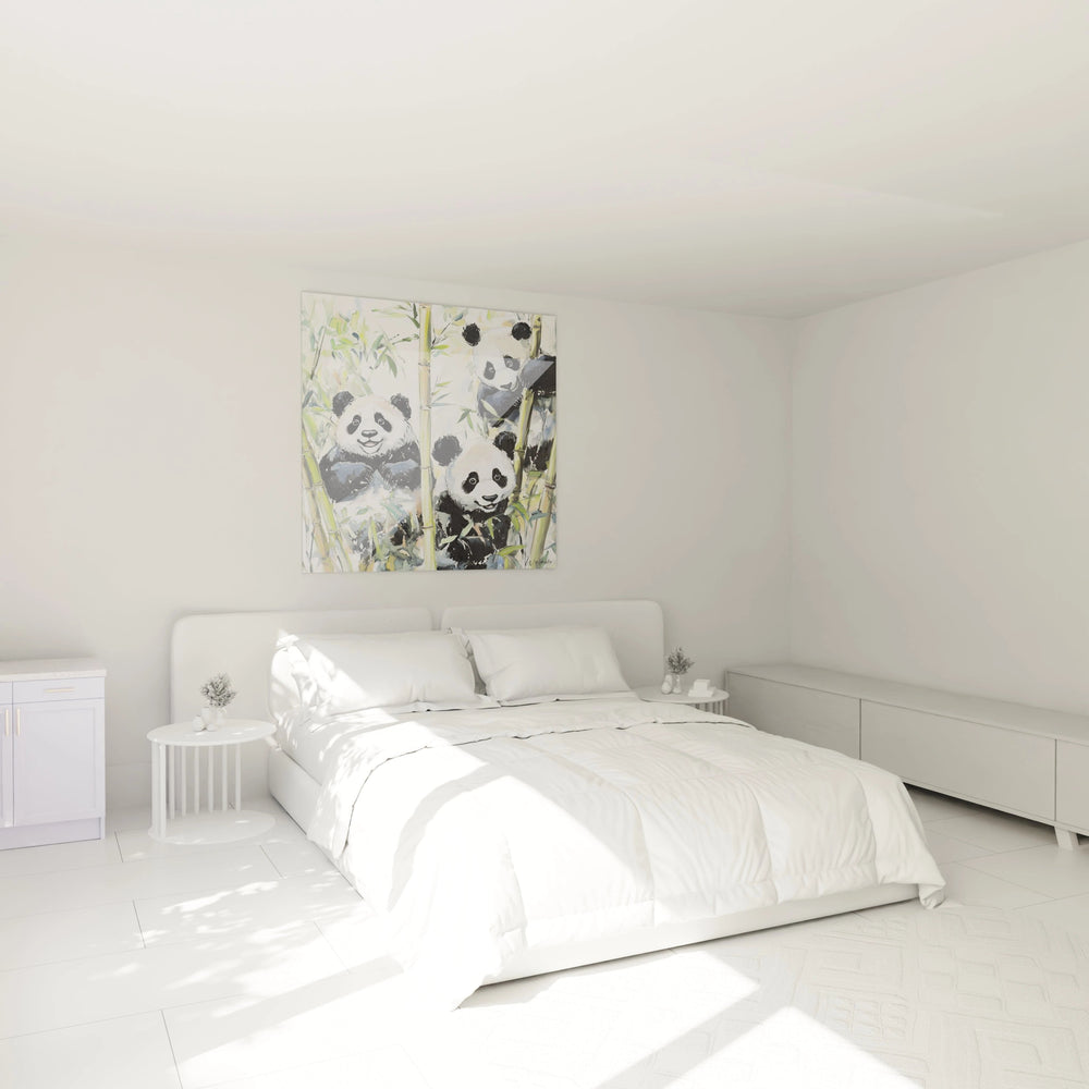 L'examen attentif révèle une technique picturale qui mélange habilement précision et spontanéité. Le rendu du pelage des pandas montre une maîtrise remarquable des transitions entre les zones noires et blanches, avec des effets de matière qui suggèrent la douceur caractéristique de leur fourrure. Les bambous bénéficient d'un traitement plus libre, avec des coups de pinceau visibles qui apportent dynamisme et fraîcheur à l'ensemble. L'artiste a su créer des contrastes de texture entre les surfaces lisses des tiges et la texture plus organique du feuillage. Cette art mural panda technique mixte démontre une approche contemporaine qui respecte le caractère naturel du sujet tout en y apportant une interprétation artistique moderne.