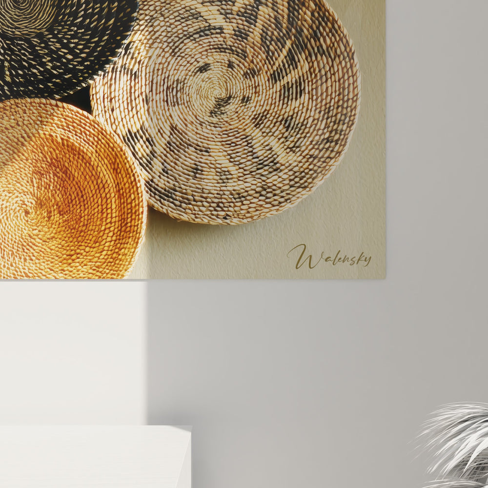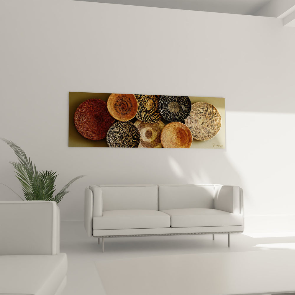 La palette chromatique de ce tableau décoratif paniers traditionnels s'articule autour de tons naturels chauds : ocres, bruns, beiges et noirs profonds. Ces couleurs évoquent la terre africaine et les fibres végétales utilisées dans la vannerie africaine traditionnelle. Chaque panier symbolise l'unité familiale, la prospérité et la protection dans de nombreuses cultures africaines. Les motifs spiralés représentent le cycle de la vie et l'éternité.