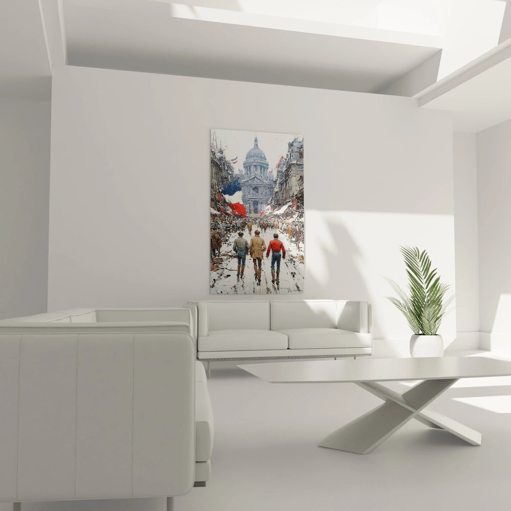 L'unicité de cette décoration murale Panthéon moment historique réside dans sa capacité à fusionner témoignage historique et émotion artistique. Contrairement aux représentations traditionnelles des événements révolutionnaires, cette œuvre privilégie l'intimité humaine au cœur du chaos urbain. La présence des trois figures anonymes au premier plan humanise la grande Histoire, créant une identification émotionnelle immédiate. Cette tableau Panthéon perspective unique offre un point de vue inhabituel, depuis le niveau de la rue plutôt que depuis une position surplombante. Les drapeaux tricolores accrochés aux fenêtres brisées créent une métaphore visuelle puissante entre destruction et renaissance nationale. Cette œuvre Panthéon symbolisme français transcende la simple représentation pour devenir allégorie de la résilience parisienne.