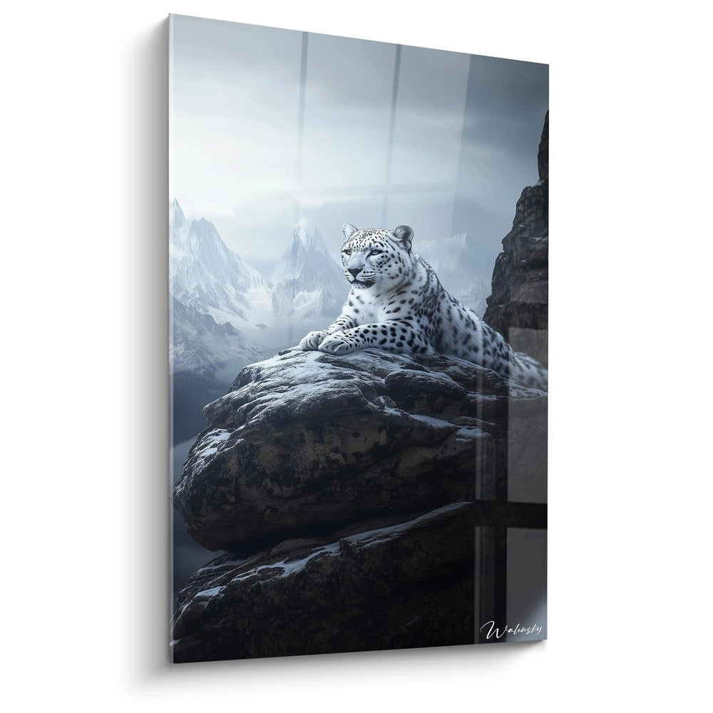 Imaginez ce moment suspendu où la panthère, silhouette élégante aux yeux bleu glacier, scrute l’horizon depuis son promontoire rocheux. La sensation de calme intense, mêlée à la vigilance constante, vous transporte au cœur des sommets enneigés, enveloppés d’une brume légère et mystérieuse. Cette œuvre vous invite à partager l’intimité d’un monde où règnent la sérénité et la résilience, au-delà du tumulte quotidien.
