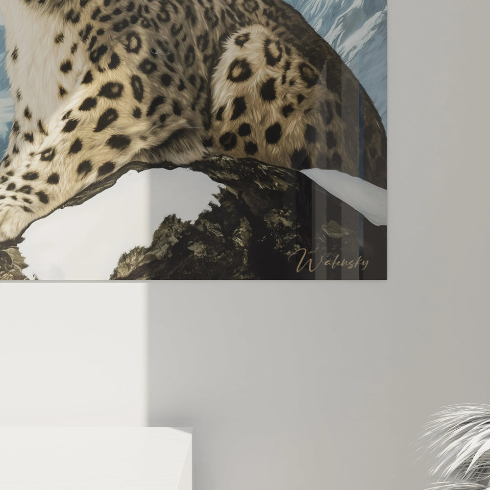 Plusieurs éléments distinguent cette œuvre des représentations classiques de panthères des neiges. L'expression du regard, à la fois sereine et vigilante, capture parfaitement la personnalité de ce félin solitaire. La position détendue mais alerte de l'animal sur son perchoir rocheux traduit son adaptation parfaite à son environnement hostile. Les proportions anatomiques respectent scrupuleusement la morphologie réelle de l'espèce, avec la queue épaisse caractéristique partiellement visible. Cette art mural panthère himalayenne se démarque également par son traitement atmosphérique subtil du paysage arrière, qui évoque la raréfaction de l'air en haute altitude. La signature discrète de l'artiste dans le coin inférieur droit atteste de l'authenticité de cette création originale.