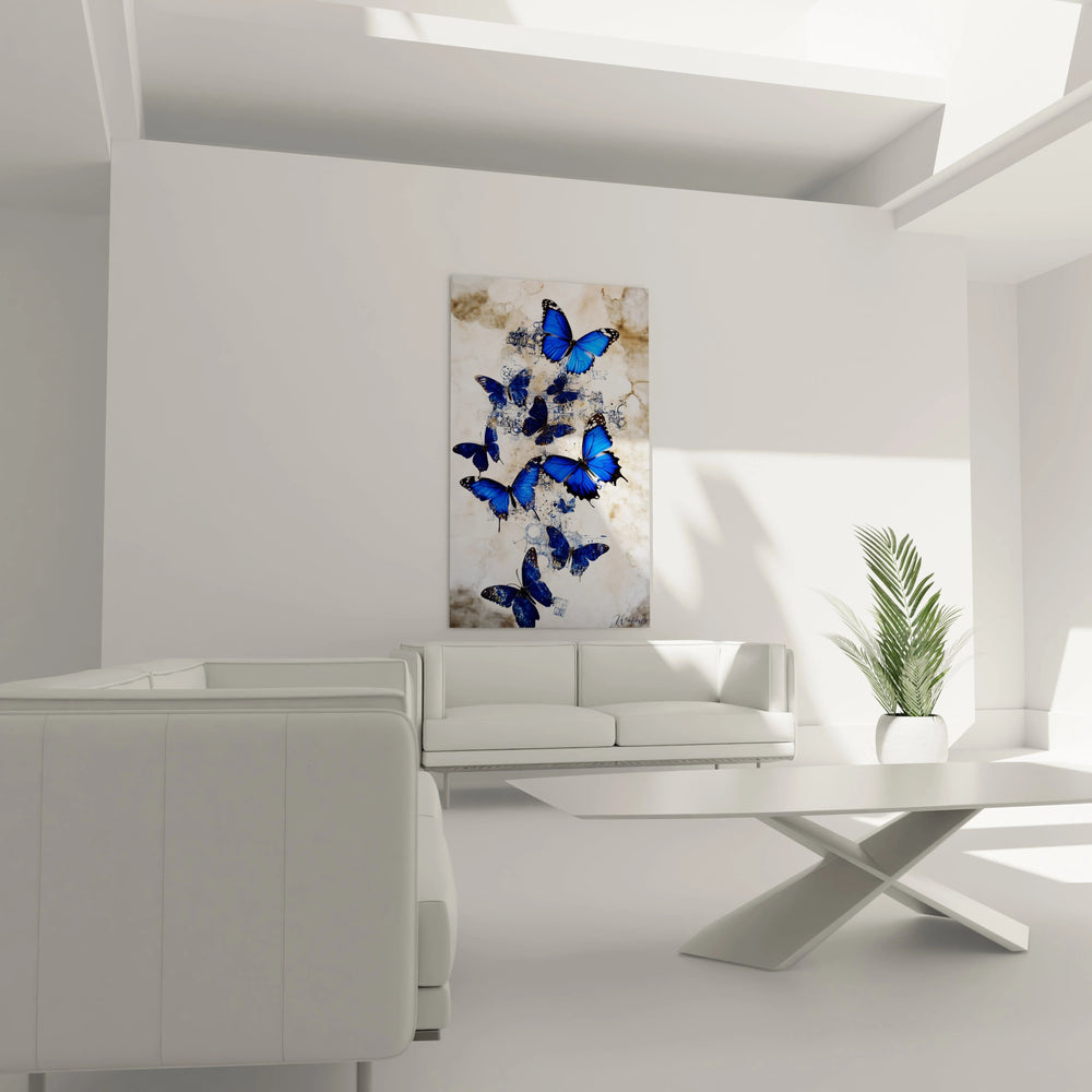 La palette chromatique de ce tableau papillon bleu cobalt repose sur une harmonie sophistiquée entre les bleus profonds et les tons neutres. Les nuances principales incluent: