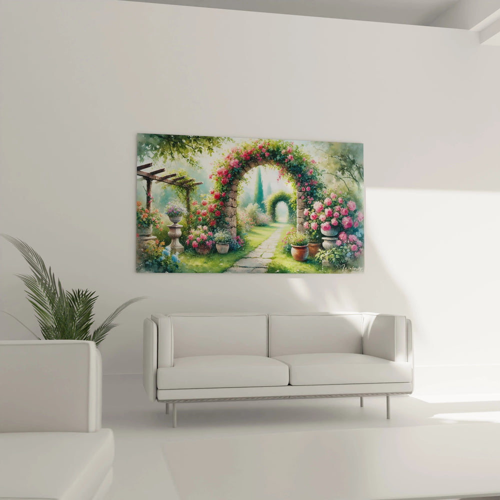 Imaginez un instant capturé où chaque détail de la nature semble murmurer la promesse d’un havre de paix. Le Tableau Paradis en Fleur - Édition Jardin Paysage est cette invitation précieuse à une promenade suspendue dans le temps, sous un arc d’élégantes roses baigné d’une lumière douce et enveloppante.