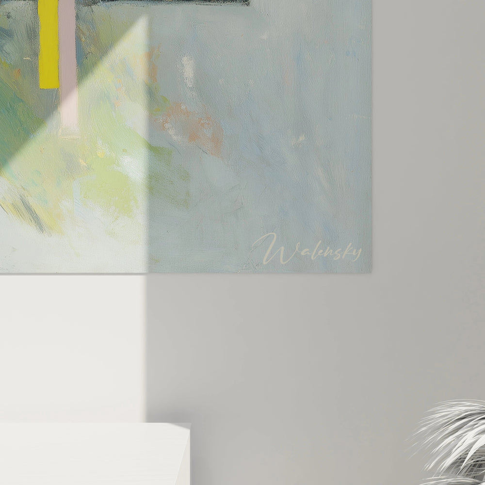 L'examen rapproché révèle une richesse texturale exceptionnelle qui enrichit l'expérience visuelle. Les empâtements visibles témoignent d'une technique picturale généreuse où la matière devient expressive. Cette décoration murale technique mixte présente des contrastes de surfaces entre zones lisses et empâtées. Les effets de lumière créent des variations subtiles qui font vibrer les couleurs selon l'angle d'observation. Les transitions entre les formes révèlent un travail minutieux où chaque passage coloré a été pensé pour créer une continuité harmonieuse. La texture globale évoque une spontanéité contrôlée qui caractérise cette approche artistique contemporaine unique.