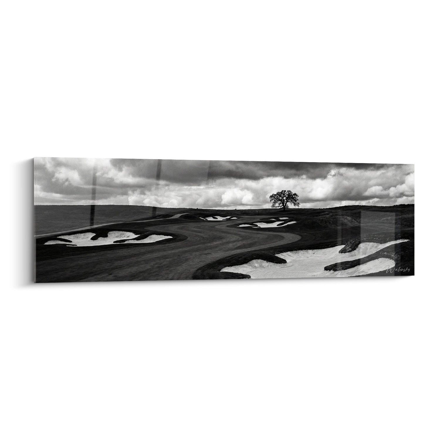Cette photographie s'inscrit dans la tradition de la photographie de paysage noir et blanc, rappelant les travaux des maîtres comme Ansel Adams. L'approche minimaliste et l'attention portée aux formes naturelles en font une pièce décorative parfaite pour les amateurs de golf et d'art photographique contemporain.