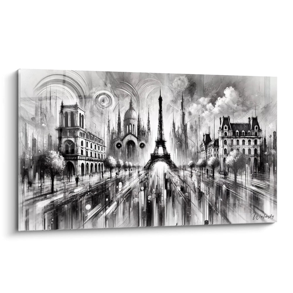 En accrochage dans votre salon, ce tableau devient une fenêtre ouverte sur une ville suspendue hors du temps, où chaque détail invite à la contemplation. Les contrastes subtils entre le noir profond et le blanc éclatant créent une tension visuelle captivante, évoquant le murmure des rues pavées et le souffle discret du vent sur la Seine. Les courbes aériennes qui dansent au-dessus des monuments symbolisent la rencontre entre histoire et rêve, modernité et mystère.