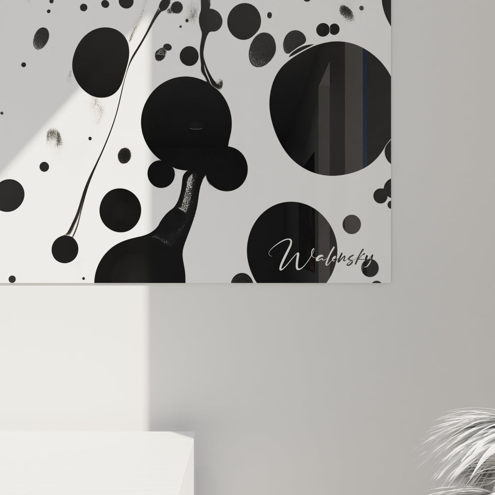Ce tableau éclaboussures abstraites présente une composition dynamique où des formes circulaires noires de tailles variées s'éparpillent sur un fond blanc immaculé. L'œuvre révèle immédiatement son caractère spontané à travers cette décoration murale éclaboussures qui évoque un mouvement de projection libre et énergique. Les gouttes et taches se répartissent de manière organique, créant un rythme visuel captivant qui attire instantanément l'attention. Cette art mural éclaboussures contemporain démontre une maîtrise technique remarquable dans l'équilibre entre contrôle et spontanéité. Les variations de densité créent des zones de respiration et d'intensité qui guident naturellement le regard à travers la composition.