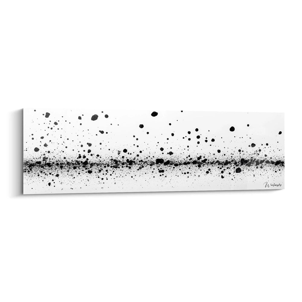 Ce tableau éclaboussures noir et blanc captive immédiatement par sa composition dynamique et spontanée. L'œuvre présente une explosion contrôlée de particules noires sur un fond blanc immaculé, créant un contraste saisissant qui évoque à la fois le chaos et l'harmonie. La décoration murale éclaboussures moderne se distingue par sa bande horizontale dense qui traverse la toile, ponctuée de projections aléatoires qui s'élèvent vers le haut. Cette tableau éclaboussures abstrait contemporain transforme l'accident en art, offrant une méditation visuelle sur le mouvement figé dans le temps.