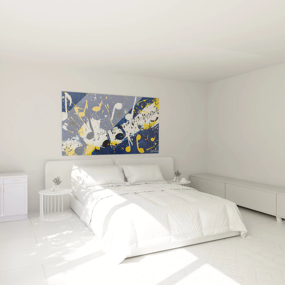 Ce tableau musique abstraite captive immédiatement par son explosion de créativité visuelle où notes musicales et portées dansent dans un chaos harmonieux. L'œuvre présente une composition dynamique sur fond bleu profond, ponctuée d'éclaboussures jaunes vibrantes et de blanc pur. Les éléments musicaux traditionnels - notes noires, portées ondulantes - se mélangent à des projections de peinture spontanées, créant un tableau musique contemporaine d'une intensité remarquable. Cette œuvre transcende la représentation classique pour devenir une manifestation visuelle pure de l'énergie musicale, où chaque éclaboussure semble résonner d'une mélodie invisible.