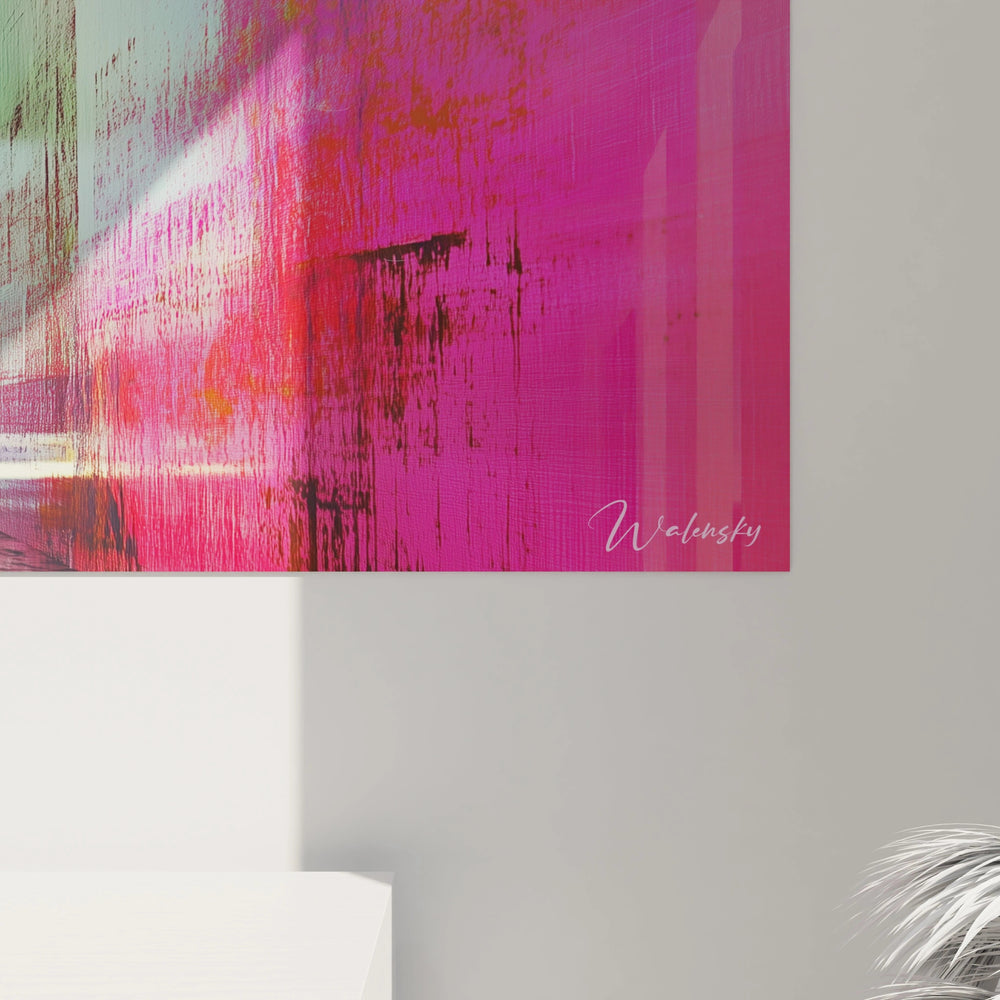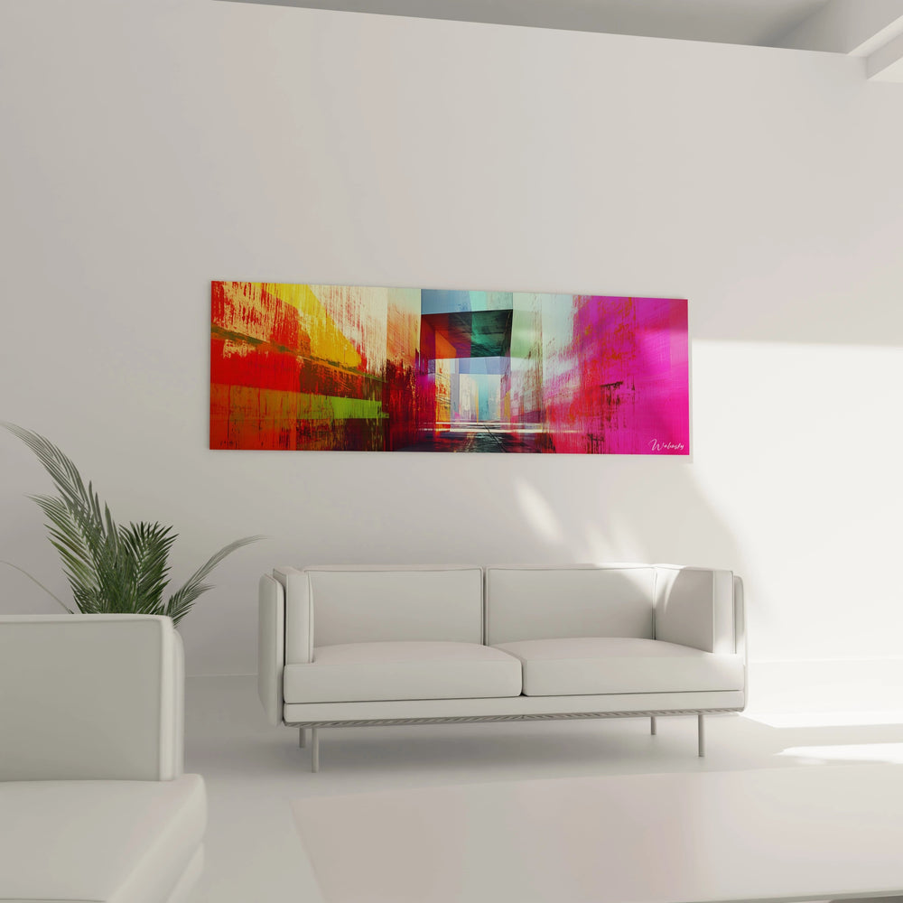 Ce tableau perspective colorée captive par sa composition dynamique créant l'illusion d'un passage lumineux qui invite le regard à s'enfoncer dans la profondeur. Les plans superposés de couleurs vives génèrent un effet tridimensionnel saisissant. La structure architecturale abstraite, définie par des lignes perspectivistes, contraste avec les textures rugueuses et les dégradés chromatiques. Un jeu d'ombres et de lumières matérialise un tunnel vibrant d'énergie urbaine contemporaine.
