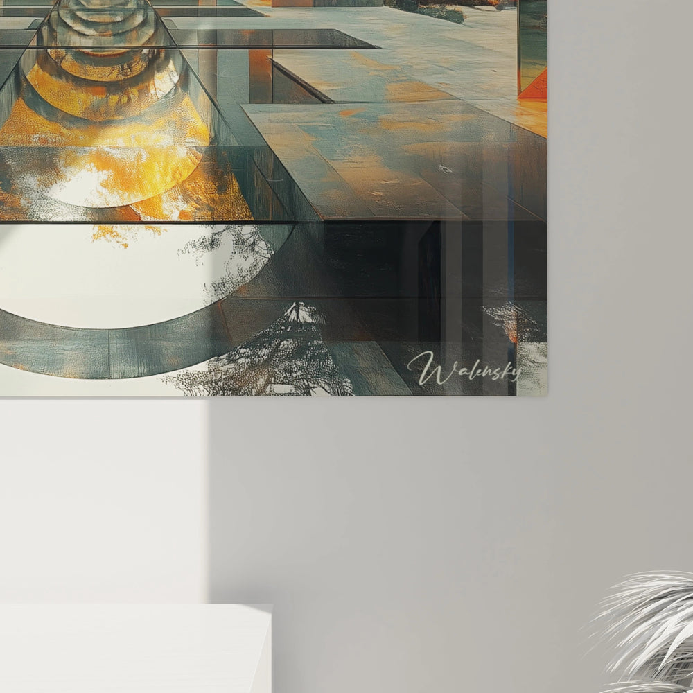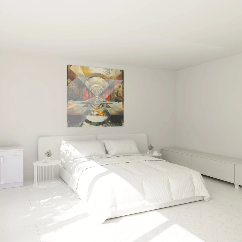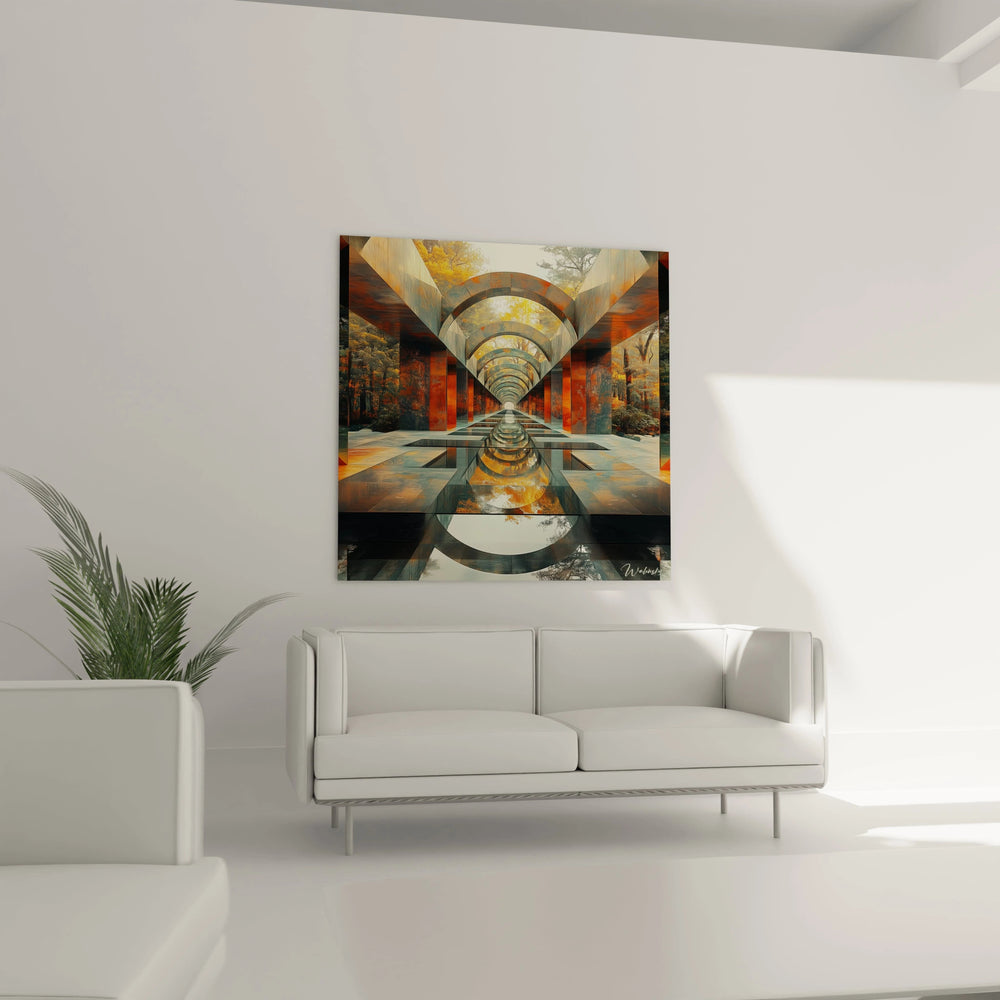 Ce tableau tunnel présente une architecture géométrique saisissante qui capte immédiatement l'attention par sa perspective infinie. L'œuvre révèle un corridor aux arcs successifs qui s'enfoncent vers un point de fuite lumineux, créant une profondeur hypnotique. Les tableau tunnel perspective infinie et ses reflets aquatiques au premier plan amplifient l'effet de grandeur monumentale. Cette décoration murale tunnel combine magistralement géométrie pure et éléments naturels, avec des arbres automnaux qui percent à travers la structure. L'ensemble génère une sensation de voyage initiatique vers l'inconnu, où chaque arche devient une porte vers une dimension nouvelle.