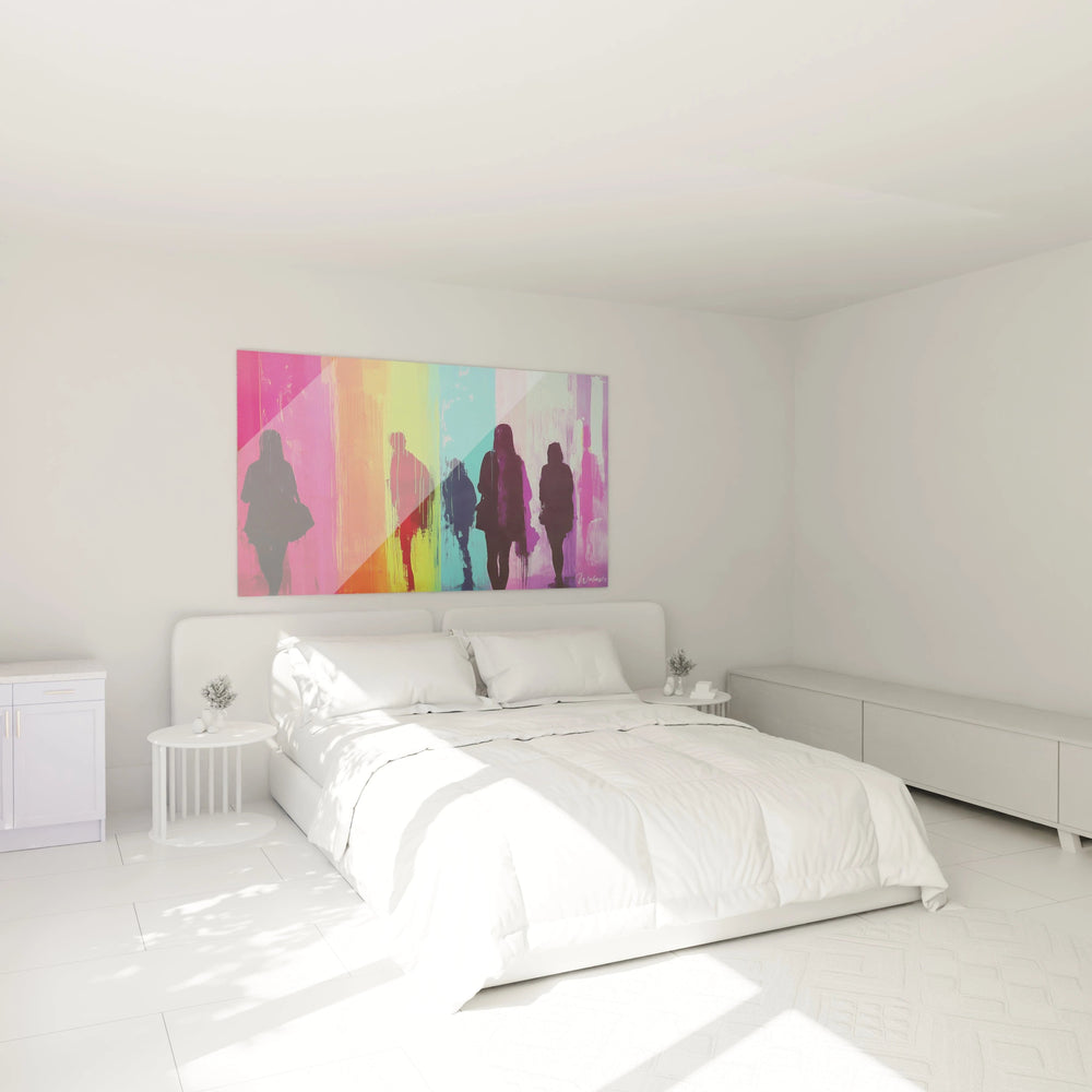 Ce tableau silhouettes multicolores captive immédiatement par son contraste saisissant entre des silhouettes humaines sombres et un arrière-plan éclatant composé de bandes verticales aux couleurs vives. L'œuvre présente cinq figures anonymes disposées sur un fond arc-en-ciel lumineux, créant une sensation de mouvement figé dans le temps. La composition joue avec la notion d'individualité dans la collectivité, chaque silhouette se détachant sur sa propre section chromatique tout en formant un ensemble harmonieux.