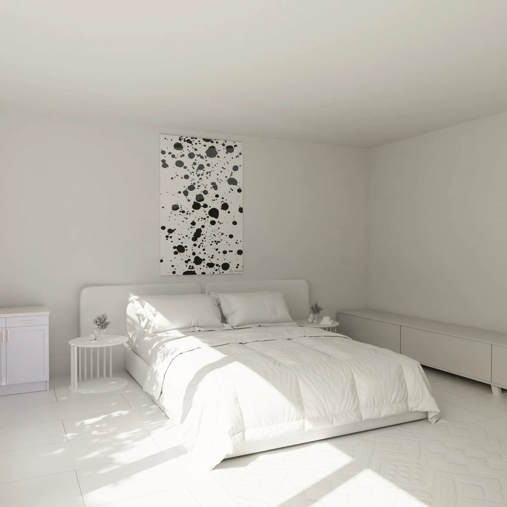 Ce tableau taches noir et blanc se distingue par sa composition spontanée et organique qui évoque un univers de liberté créative absolue. L'œuvre présente une multitude de taches de différentes tailles dispersées de manière naturelle sur un fond blanc immaculé, créant un contraste saisissant. Le tableau taches abstraites contemporain génère une première impression de mouvement perpétuel et d'énergie brute. Chaque tache semble avoir trouvé sa place de façon instinctive, formant un ensemble harmonieux malgré l'apparente anarchie. Cette décoration murale taches graphiques capte immédiatement l'attention par son caractère à la fois minimal et expressif, offrant une expérience visuelle qui évoque la spontanéité de l'art gestuel.