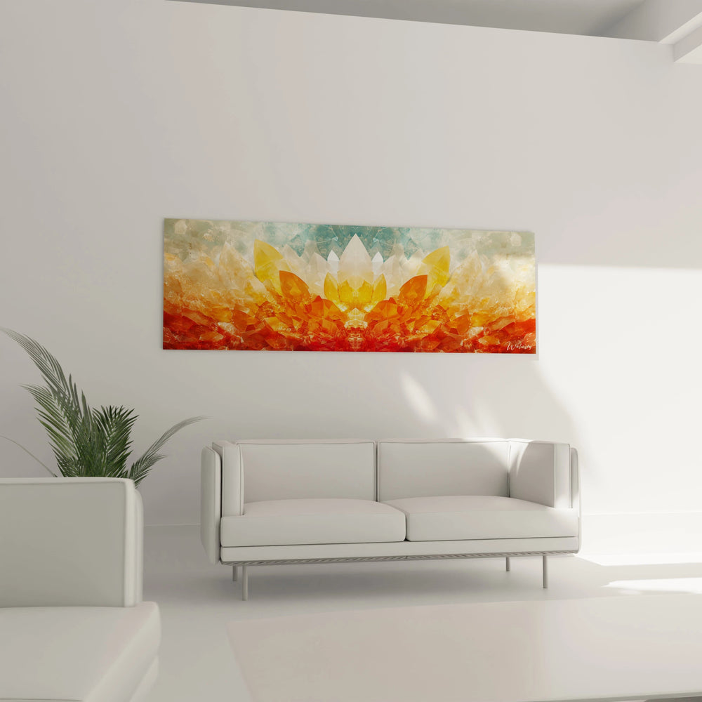 Cette décoration murale lotus mandala se distingue par plusieurs éléments visuels impossibles à reproduire. L'interprétation géométrique du lotus traditionnel crée une fusion unique entre spiritualité orientale et esthétique contemporaine occidentale. Les angles précis des pétales contrastent avec la fluidité du dégradé coloré, générant une tension visuelle captivante. Le format panoramique amplifie l'impact décoratif, transformant cette œuvre lotus panoramique en véritable statement artistique. Les proportions spécifiques et l'équilibre des masses colorées font de ce tableau lotus géométrique premium une pièce collector distinctive, reconnaissable entre mille par sa signature visuelle particulière.
