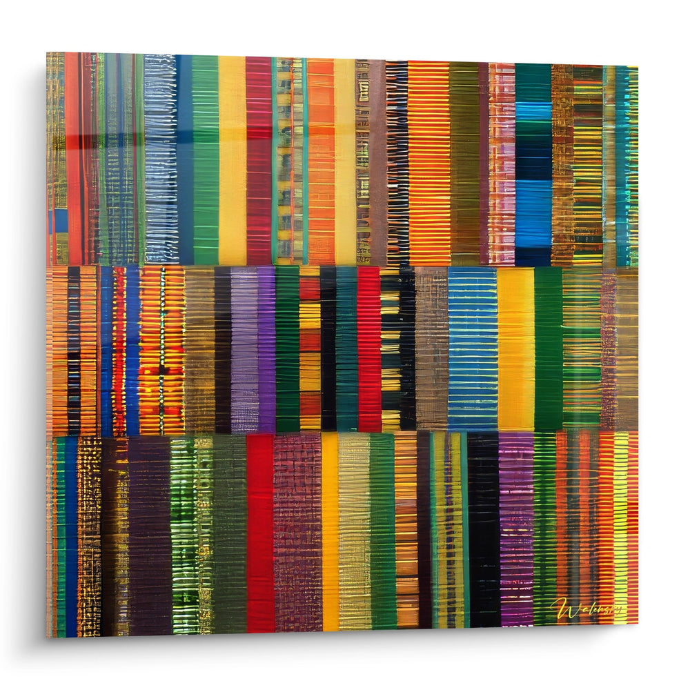 Ce tableau mural patchwork présente une composition exceptionnelle inspirée des tissus traditionnels d'Afrique. L'œuvre se divise en multiples sections rectangulaires, chacune évoquant les motifs caractéristiques du textile africain authentique. On y découvre une mosaïque de bandes colorées rappelant les célèbres tissus kente du Ghana, avec leurs rayures horizontales dans des teintes éclatantes d'orange, de rouge, de vert et de bleu. Certaines sections reproduisent fidèlement les motifs géométriques africains traditionnels, alternant entre des lignes fines et des bandes plus larges. Le tableau décoratif ethnique intègre également des zones aux tonalités plus sombres, créant un contraste saisissant avec les sections aux couleurs vives. Les variations de texture simulées donnent l'impression d'observer de véritables échantillons de tissus wax africains assemblés avec soin. Cette représentation artistique du patrimoine textile capture parfaitement l'essence des traditions artisanales africaines, transformant un mur en véritable galerie d'art ethnique contemporain.