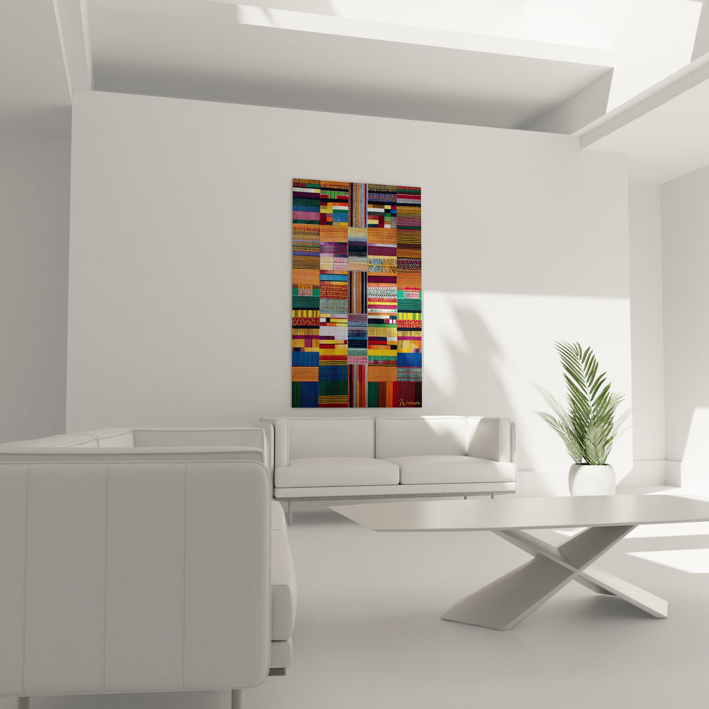 Ce tableau mural patchwork présente une composition exceptionnelle de tissus africains traditionnels assemblés en mosaïque colorée. L'œuvre rassemble une multitude de motifs géométriques caractéristiques de l'artisanat textile africain, créant un véritable kaléidoscope de couleurs et de textures. Chaque bande de tissu raconte une histoire, portant les codes visuels spécifiques des différentes ethnies d'Afrique. Les rayures multicolores, les motifs géométriques traditionnels et les trames variées s'entremêlent harmonieusement, formant une composition contemporaine qui honore l'héritage ancestral. Cette décoration murale ethnique sublime l'art du tissage africain, où dominent les tons ocre, bleu indigo, rouge vermillon et vert émeraude. Les bandes horizontales et verticales créent un rythme visuel dynamique, évoquant les textiles ceremonials d'Afrique utilisés lors des festivités traditionnelles. Cette œuvre représente parfaitement la richesse culturelle du continent africain à travers son patrimoine textile, transformant un simple tableau décoratif africain en véritable hymne à la diversité artistique.