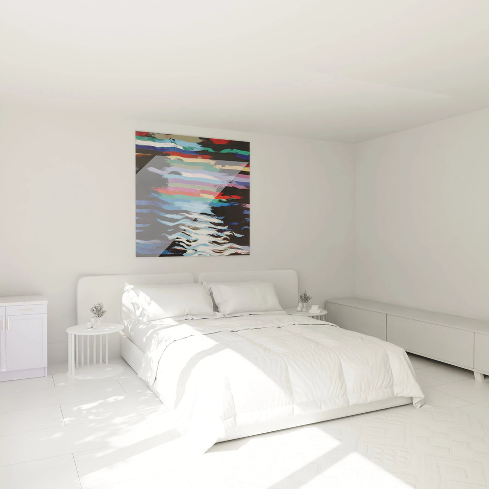 Cette œuvre se distingue par sa capacité à générer une sensation de mouvement perpétuel sans recourir à des formes figuratives explicites. Les ondulations caractéristiques créent un effet hypnotique qui différencie radicalement cette création des paysages abstraits conventionnels. La signature discrète située en bas à droite confirme l'authenticité de cette décoration murale paysage abstrait contemporain. Les proportions spécifiques et l'agencement unique des bandes colorées rendent impossible toute reproduction identique. L'équilibre particulier entre spontanéité gestuelle et contrôle chromatique révèle une approche artistique mûrie et personnelle. Cette caractéristique distinctive place l'œuvre dans une catégorie esthétique spécifique, entre expressionnisme abstrait et art optique.