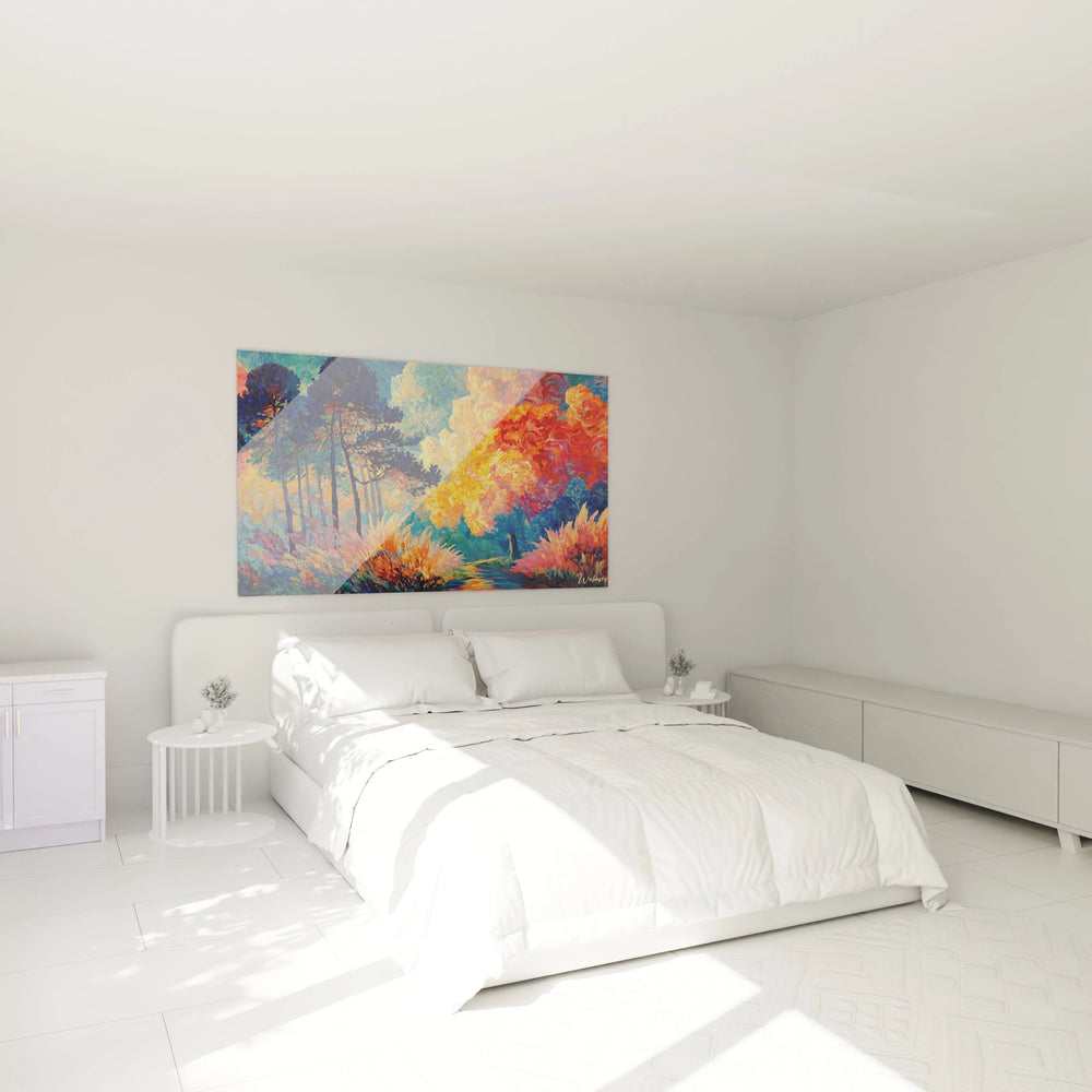 Cette décoration murale paysage coloré s'épanouit particulièrement dans des espaces bénéficiant d'un éclairage naturel indirect qui révèle toute la subtilité de ses nuances. L'œuvre s'harmonise parfaitement avec des intérieurs aux tons neutres - beiges, crèmes, blancs cassés - qui permettent à ses couleurs de s'exprimer pleinement. Un éclairage d'appoint à température chaude (2700-3000K) accentue la chaleur des oranges et des dorés. Cette œuvre paysage forestier trouve sa place idéale dans un salon, une bibliothèque ou un bureau, apportant une touche de sérénité naturelle et d'élégance chromatique à l'environnement.