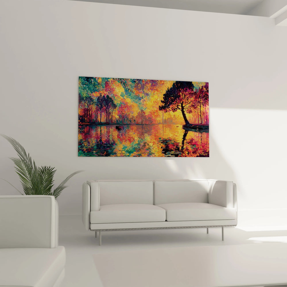 L'originalité de cette œuvre réside dans sa capacité à transformer un paysage classique en explosion sensorielle pure. Chaque feuille devient prétexte à une recherche chromatique poussée, où les couleurs se mélangent optiquement plutôt que physiquement. La signature artistique visible en bas à droite authentifie cette création unique, impossible à reproduire dans ses nuances exactes. Cette art mural paysage automne unique se distingue par son traitement particulier de la lumière dorée qui nimbe l'ensemble de la scène d'une aura presque mystique. L'intensité émotionnelle dégagée par cette composition transcende la simple représentation pour atteindre une dimension poétique remarquable. Les variations chromatiques infinies créent un spectacle visuel sans cesse renouvelé selon l'éclairage ambiant.