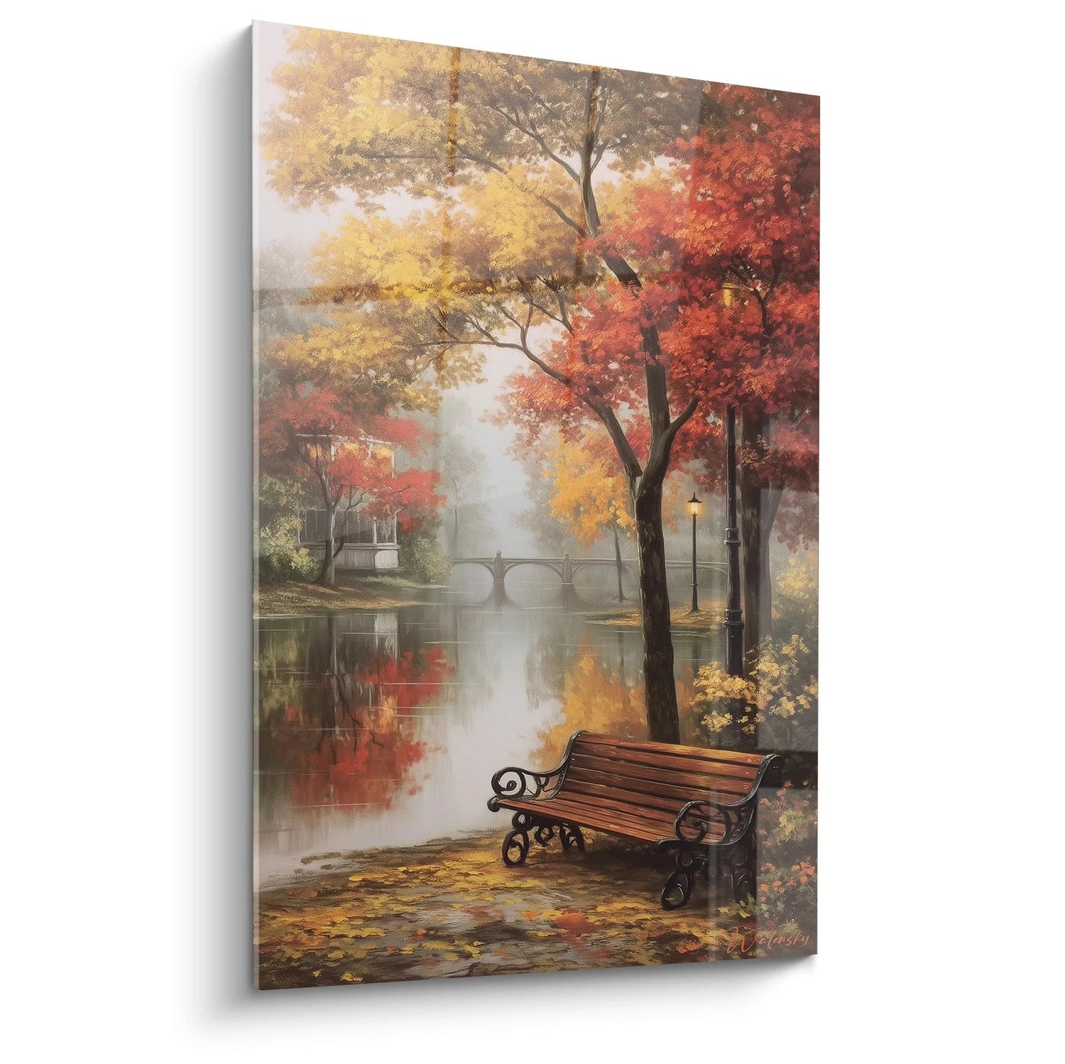 Cette œuvre captivante représente un tableau paysage automne d'une beauté saisissante, où la brume matinale enveloppe délicatement un parc urbain aux couleurs flamboyantes. Le tableau paysage brumeux révèle une scène romantique avec un banc en fonte au premier plan, invitant à la contemplation. Les reflets dorés se miroitent parfaitement sur l'eau calme, créant une symphonie visuelle entre les tons chauds des feuillages et la douceur vaporeuse de l'atmosphère. Cette décoration murale paysage transforme instantanément l'ambiance d'un intérieur grâce à sa palette chromatique exceptionnelle et son atmosphère apaisante.