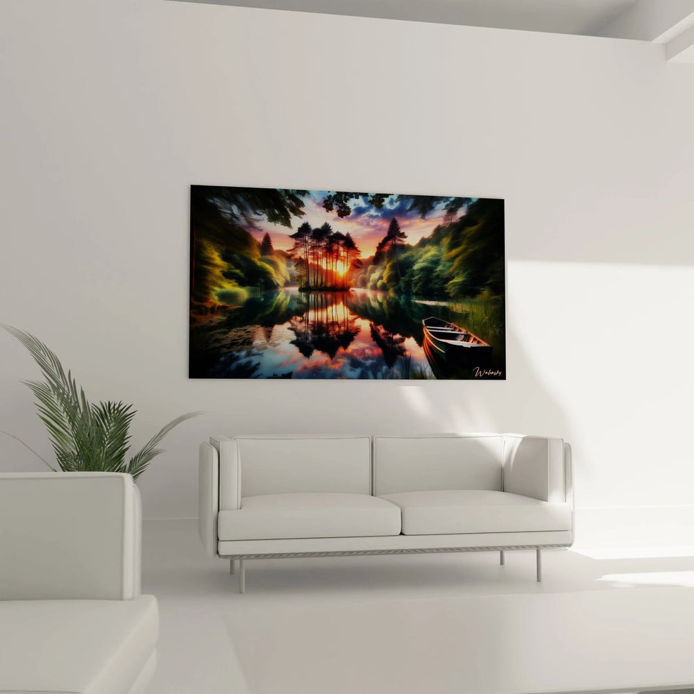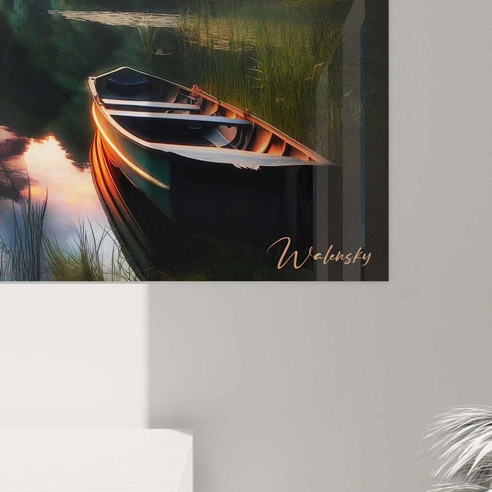 Plongez dans un univers où la nature se révèle dans toute sa splendeur intimiste avec ce magnifique Tableau Barque Oubliée en Éden Secret - Édition Paysage. Imaginez-vous au cœur d’un crépuscule caressant, la lumière douce du soleil couchant qui danse à la surface d'un lac tranquille, tandis qu’une barque solitaire dérive paisiblement sur une étendue d’eau reflétant un ciel aux teintes rouges, roses et orangées vibrantes.