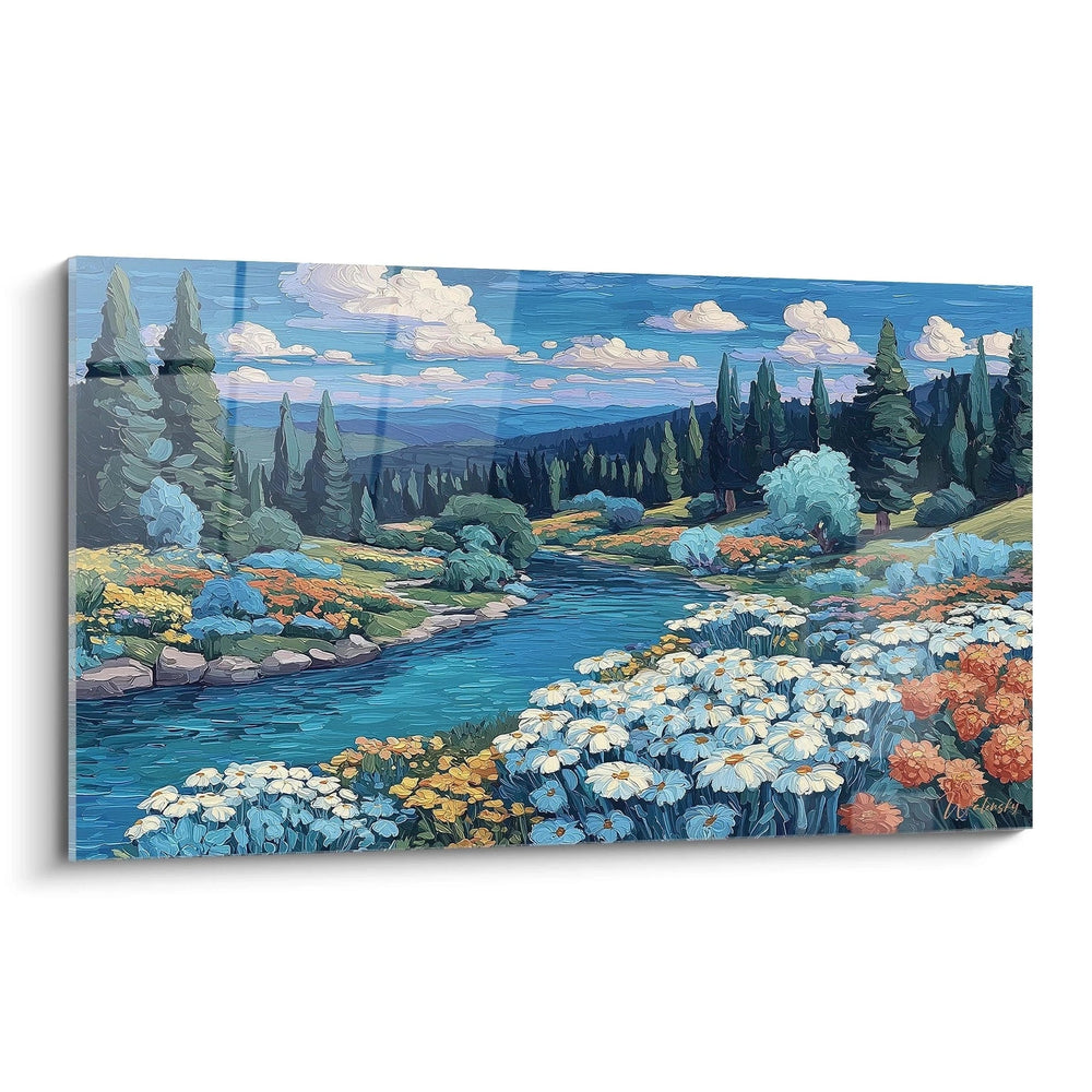 Ce tableau paysage rivière présente une composition exceptionnelle mêlant cours d'eau serpentant et prairies fleuries. L'œuvre révèle un style impressionniste moderne où dominent les tons bleus profonds de la rivière contrastant avec les blancs éclatants des marguerites sauvages. Ce tableau paysage montagne boisée offre une perspective unique sur un écosystème préservé, avec des conifères émeraude s'élevant vers un ciel nuageux aux teintes pastel. La technique visible par touches distinctes crée une texture riche qui accroche la lumière naturelle, révélant différents aspects selon l'angle d'observation.