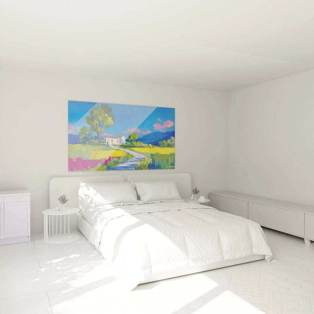 Ce tableau paysage révèle une scène rurale d'une beauté saisissante, dominée par une maison provençale aux murs blancs qui trône majestueusement au centre de la composition. Le tableau paysage campagne colorée déploie une palette chromatique audacieuse où se mêlent harmonieusement les verts éclatants de la végétation, le bleu profond des montagnes à l'horizon et les roses tendres des nuages. Un chemin sinueux guide naturellement le regard vers l'habitation, créant une profondeur remarquable. Cette œuvre paysage rural capture l'essence même de la campagne méditerranéenne avec ses contrastes lumineux et ses couleurs pures appliquées par touches expressives.