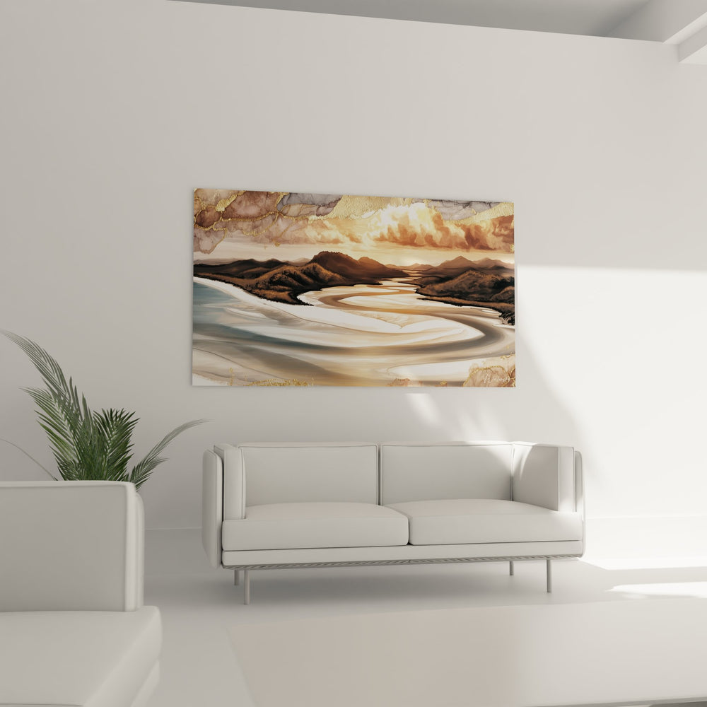 Ce magnifique tableau paysage côtier abstrait capture l'essence poétique des rivages dans une interprétation artistique moderne. L'œuvre présente une vue panoramique saisissante où se mélangent harmonieusement montagnes, plages et eaux calmes. Les tons dorés dominent la composition, créant une atmosphère chaleureuse et lumineuse qui évoque les plus beaux couchers de soleil sur la côte. La technique de peinture fluide utilisée confère au tableau mural paysage une dimension onirique, où les formes se fondent naturellement les unes dans les autres. Les veines dorées qui traversent l'œuvre rappellent les reflets du soleil sur l'eau et ajoutent une touche de luxe à cette décoration murale plage. Les nuances de beige, crème et ocre se marient parfaitement avec les touches de doré, créant un ensemble visuel apaisant. Cette peinture abstraite côtière transforme n'importe quel espace en sanctuaire de sérénité, invitant à la contemplation et à l'évasion. L'artiste a su capturer l'essence même des paysages marins dans une approche contemporaine qui transcende la simple représentation.