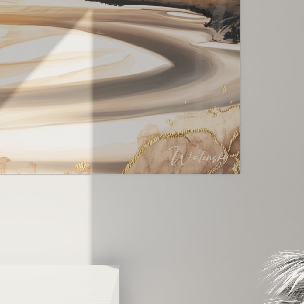 Cette œuvre d'art murale moderne s'inscrit dans la tradition de l'art abstrait contemporain, rappelant les œuvres de peintres paysagistes modernes. L'approche fluide et organique évoque les techniques de coulée utilisées dans l'art contemporain. Ce tableau abstrait doré trouve sa place aux côtés des grandes œuvres d'art décoratif qui célèbrent la beauté naturelle des paysages côtiers.