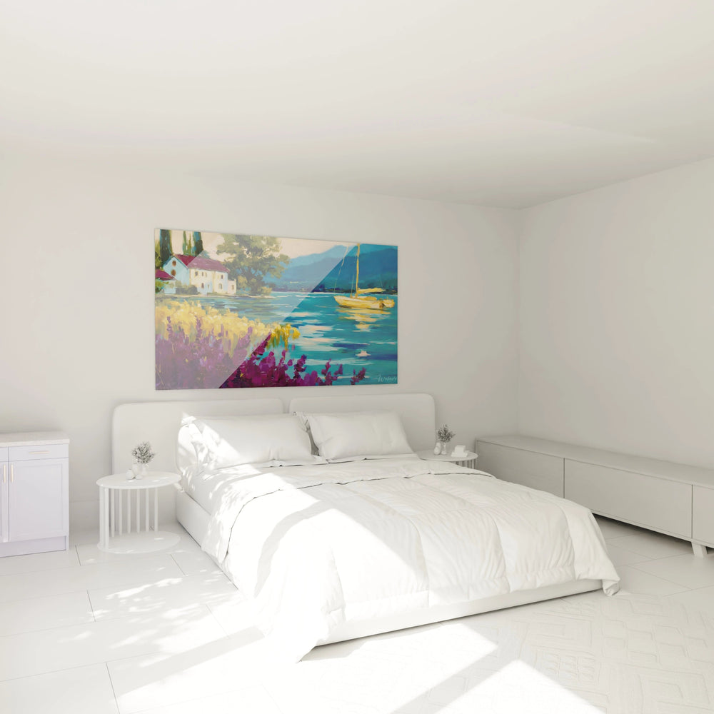 Ce tableau paysage côtier capture la beauté sereine d'un village méditerranéen avec ses maisons blanches aux toits pourpres, nichées entre une végétation luxuriante et les eaux cristallines d'une baie tranquille. L'œuvre présente un tableau paysage méditerranéen où un élégant voilier jaune doré flotte paisiblement, créant un point focal harmonieux. Les couleurs vibrantes - du bleu profond de l'eau aux violets intenses de la végétation - révèlent une décoration murale paysage côtier parfaite pour apporter une atmosphère apaisante à tout intérieur. Cette œuvre paysage maritime évoque immédiatement l'art de vivre méditerranéen grâce à ses tonalités chaudes et ses reflets lumineux sur l'eau.
