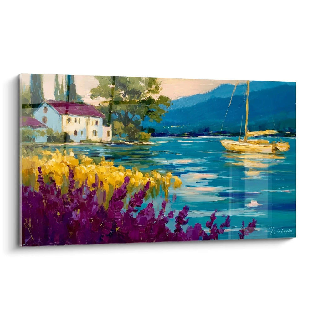 La composition de ce tableau paysage côtier technique impressionniste suit une perspective classique en trois plans distincts. Au premier plan, la végétation violette et jaune crée un cadrage naturel qui guide le regard vers les éléments centraux. Les maisons blanches occupent harmonieusement la partie gauche de la toile, équilibrant parfaitement avec le voilier positionné sur la droite. L'horizon se dessine délicatement entre les montagnes et le ciel, créant une ligne de fuite naturelle. Cette décoration murale paysage maritime respecte la règle des tiers, plaçant les éléments clés aux intersections visuelles stratégiques. L'eau occupe généreusement l'espace central, permettant aux reflets de jouer un rôle majeur dans l'harmonie générale.