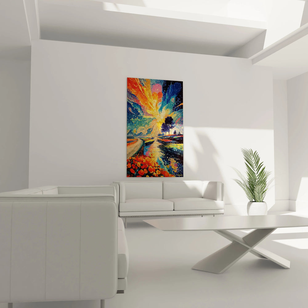 L'unicité de cette œuvre réside dans sa capacité à transformer un paysage classique en vision extraordinaire grâce au traitement pointilliste exceptionnel. L'explosion céleste, particulièrement remarquable, semble irradier depuis un point central invisible, créant un effet de mouvement et d'énergie rarement observé dans l'art paysager traditionnel. La position stratégique de l'arbre solitaire apporte une dimension contemplative et mélancolique qui contraste magnifiquement avec le dynamisme du ciel. Cette art mural paysage se distingue également par sa palette chromatique audacieuse qui dépasse les conventions naturalistes pour offrir une interprétation poétique et émotionnelle de la nature.