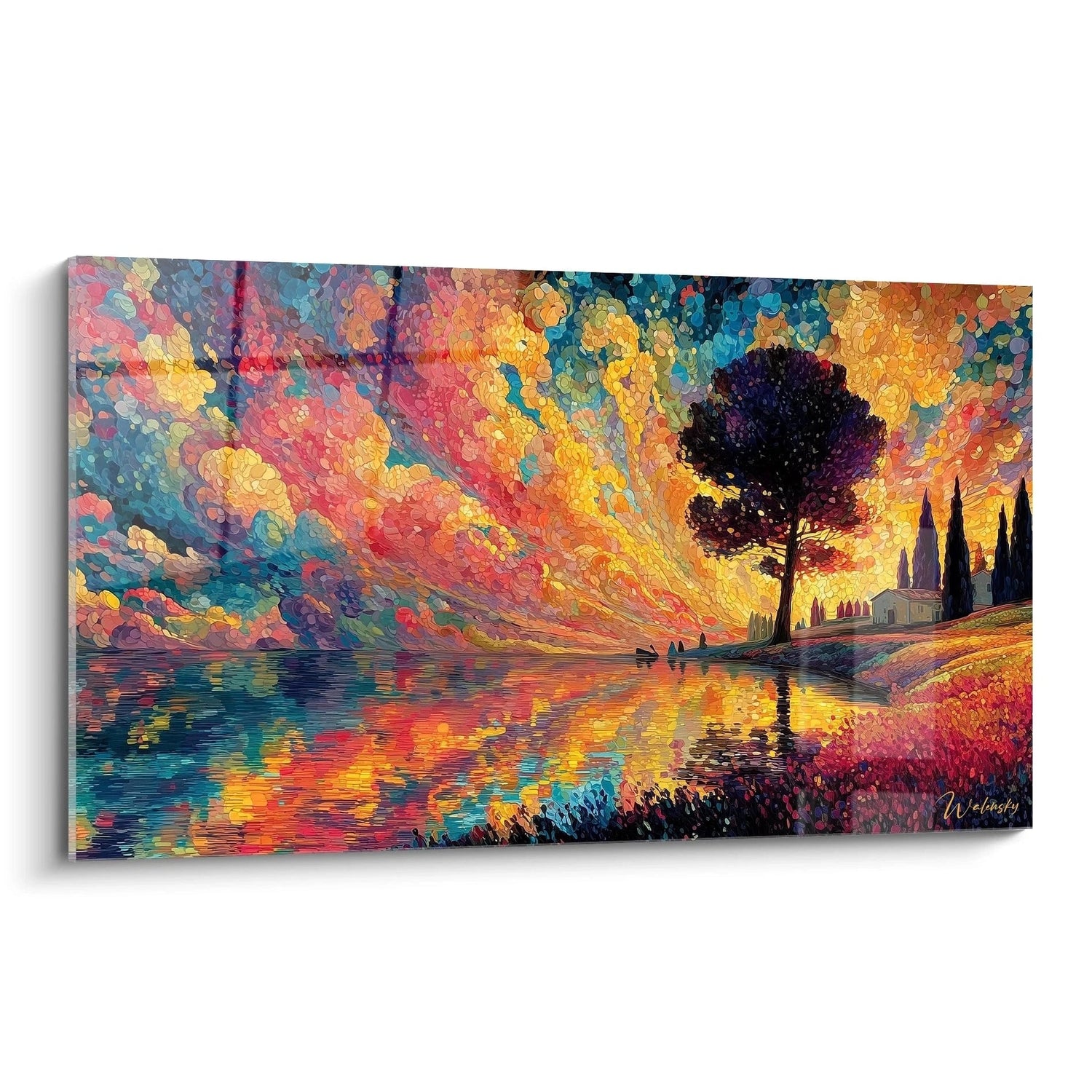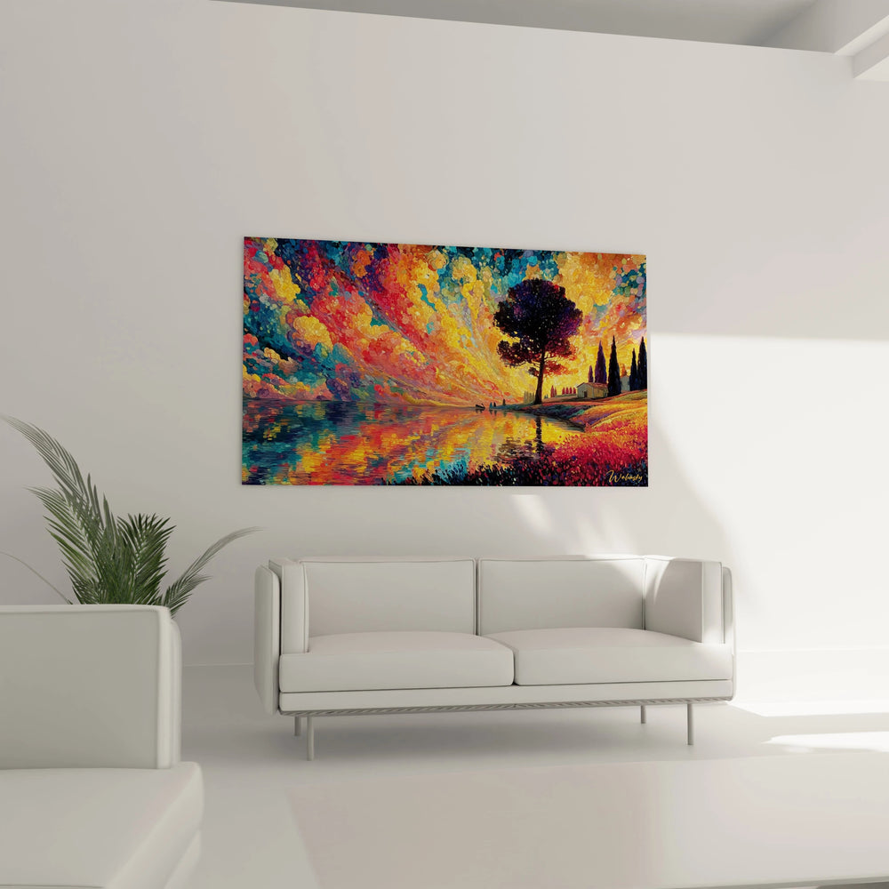 Cette œuvre d'art mural se distingue par sa composition parfaitement équilibrée où chaque élément trouve sa place harmonieuse. Le sujet principal - un paysage lacustre au coucher du soleil - déploie une technique pointilliste contemporaine d'une richesse extraordinaire. Les cyprès noirs créent un contraste saisissant avec l'explosion chromatique du ciel, tandis que l'eau reflète fidèlement cette symphonie de couleurs. Cette art mural paysage révèle une profondeur émotionnelle remarquable, invitant le spectateur à une contemplation apaisante. La signature discrète témoigne de l'authenticité de cette création unique.