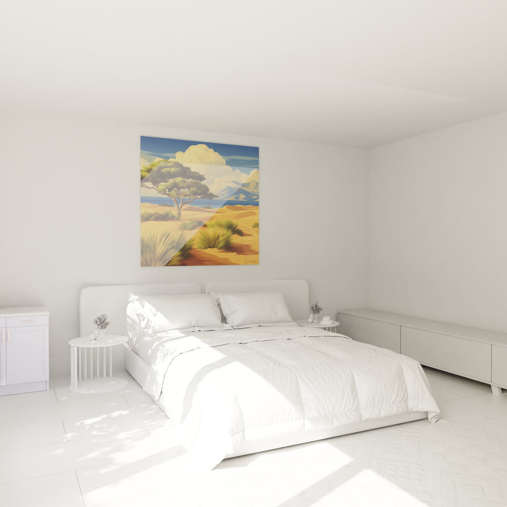Ce tableau mural paysage désertique capture la beauté saisissante de la savane africaine dans toute sa splendeur naturelle. Au centre de cette œuvre d'art désert, un majestueux acacia déploie sa couronne verdoyante, symbole de résistance face à l'aridité du climat. L'arbre solitaire se dresse fièrement sur des dunes dorées qui ondulent jusqu'à l'horizon, créant un tableau savane africaine d'une authenticité remarquable. Les tons ocre et sable dominent le premier plan, parsemés de touffes d'herbes sèches qui témoignent de la vie tenace du désert. En arrière-plan, des collines aux teintes cuivrées s'estompent dans la brume de chaleur, tandis qu'un ciel d'azur profond accueille des nuages blancs aux formes généreuses. Cette décoration murale nature révèle l'harmonie parfaite entre terre et ciel, typique des grands espaces africains. Les jeux d'ombre et de lumière confèrent à ce tableau art africain contemporain une dimension poétique exceptionnelle. Chaque élément de cette peinture paysage aride évoque la sérénité des grands espaces sauvages, transformant votre intérieur en une fenêtre ouverte sur l'immensité africaine.