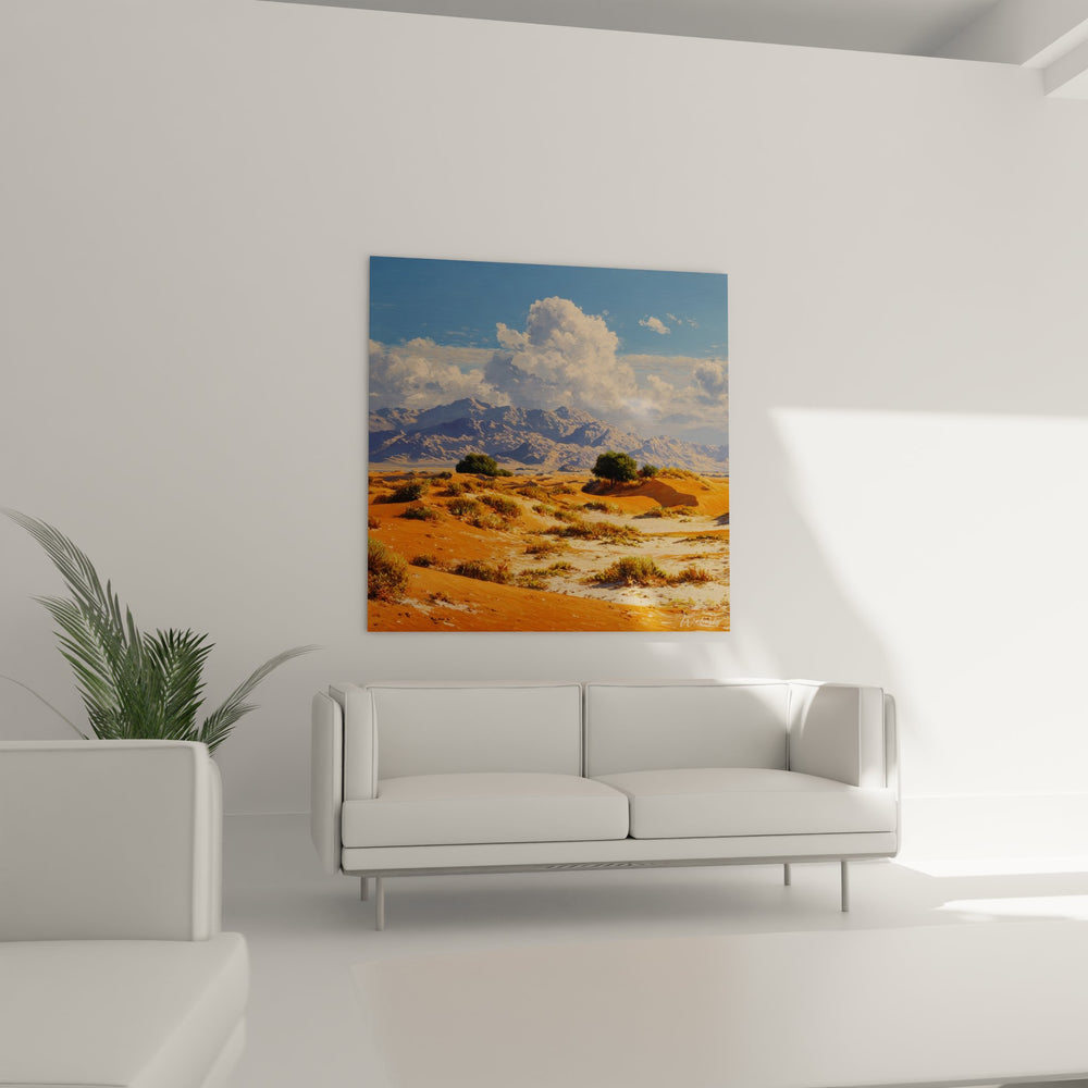 Ce tableau mural désert capture la beauté saisissante d'un paysage désertique contrasté, où se mélangent harmonieusement les tons chauds du sable et la majesté des montagnes enneigées à l'horizon. La composition révèle un désert vivant parsemé de végétation clairsemée, avec des arbustes et quelques arbres isolés qui ponctuent l'étendue sablonneuse. Au premier plan, le terrain ondulé présente des nuances d'ocre, de beige et d'orange qui évoquent la chaleur du soleil désertique. Les dunes de sable se succèdent en vagues douces, créant un rythme visuel apaisant. La chaîne montagneuse qui se dresse en arrière-plan, couronnée de neige, apporte une dimension dramatique à cette œuvre d'art désert. Le ciel, dominé par d'imposants nuages blancs aux formes sculpturales, occupe une grande partie de la toile et renforce l'impression d'immensité caractéristique des paysages arides. Cette décoration murale désert traduit parfaitement l'équilibre délicat entre aridité et vie, solitude et grandeur, créant une atmosphère contemplative idéale pour sublimer tout espace intérieur en quête d'authenticité et de sérénité.