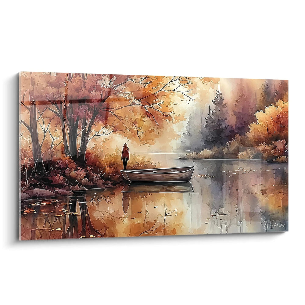 Ce tableau paysage automnal révèle une scène d'une beauté saisissante où la nature déploie sa palette chromatique la plus riche. Au centre de cette composition, une barque solitaire flotte paisiblement sur les eaux calmes d'un lac, créant un point focal parfait dans ce tableau paysage lac automne. Une silhouette féminine en manteau rouge se dresse sur la rive, apportant une touche humaine à cette symphonie naturelle. Les arbres qui encadrent la scène exhibent leurs feuillages dans des tons cuivrés et dorés, caractéristique distinctive de cette décoration murale paysage automne. La lumière douce et tamisée baigne l'ensemble, créant une atmosphère contemplative unique.