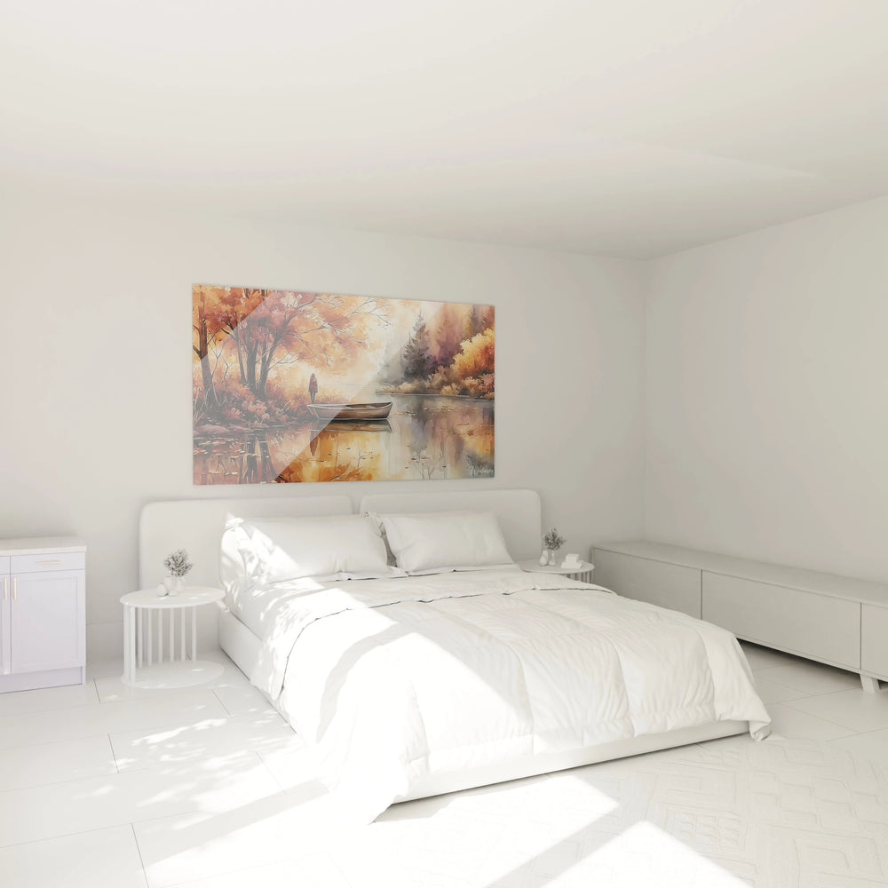 Cette œuvre se distingue par plusieurs éléments visuels exceptionnels qui en font une pièce unique. La présence de la silhouette humaine crée une dimension narrative rare dans ce type de composition, transformant un simple paysage en une scène de vie contemplative. La barque, positionnée avec une précision millimétrique, établit un dialogue poétique avec la figure humaine, suggérant un récit intemporel. Cette art mural lac automne capture un moment fugace où la lumière dorée filtre à travers les brumes matinales, créant une atmosphère presque irréelle. Les reflets parfaitement orchestrés doublent la composition, offrant une profondeur visuelle saisissante. Cette décoration murale nature contemplative possède cette rare qualité d'arrêter le temps dans un instant de pure beauté.