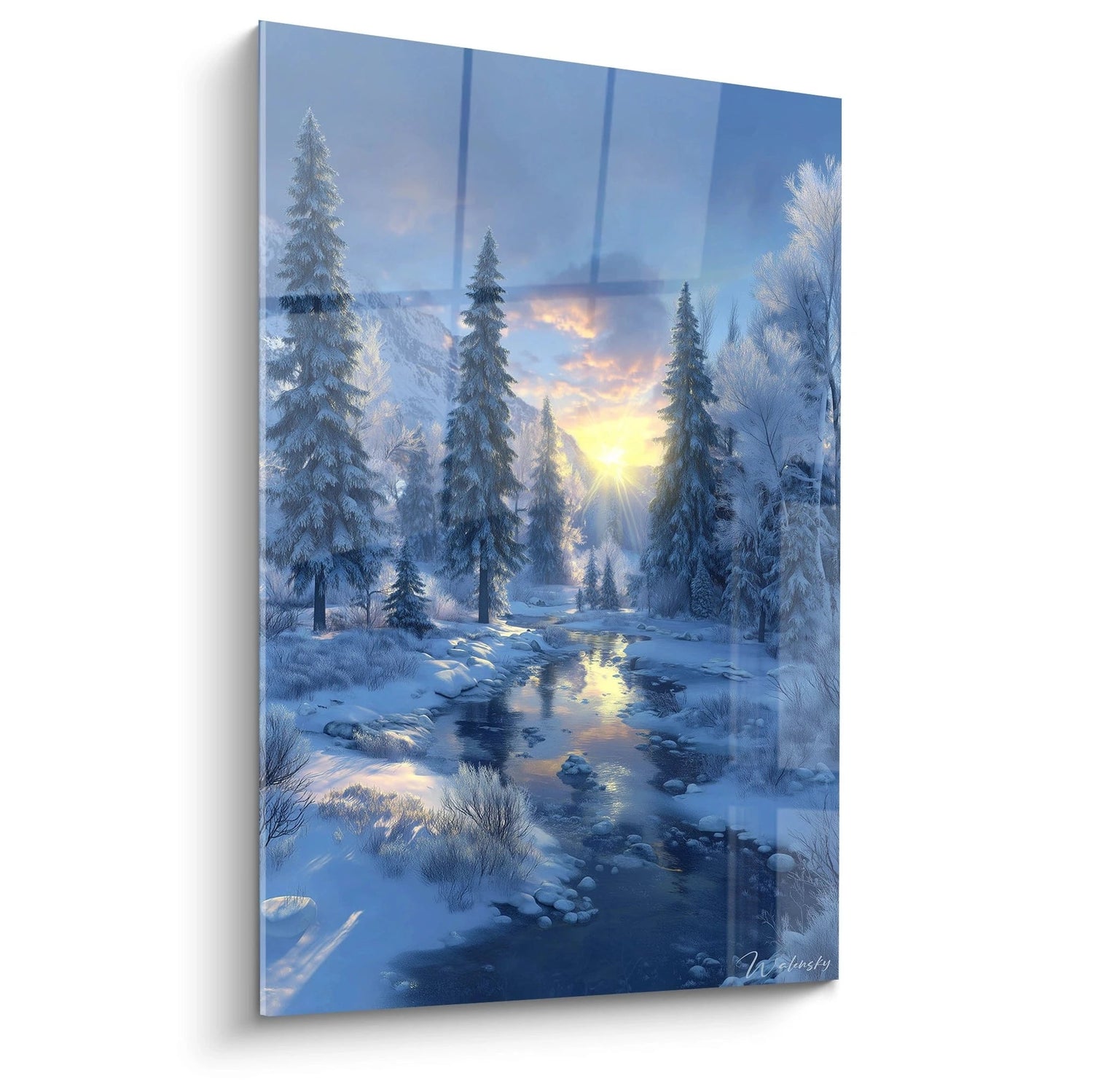 Ce tableau paysage hivernal capture un moment d'exception dans une forêt enneigée où la nature révèle toute sa splendeur hivernale. L'œuvre présente une composition magistrale centrée sur une rivière serpentant au cœur d'une forêt de conifères recouverts de neige immaculée. La lumière dorée du soleil perce à travers les nuages, créant un contraste saisissant avec les tons bleus glacés qui dominent la scène. Cette décoration murale paysage hivernal se distingue par sa capacité à transmettre une sensation de paix et de contemplation. Les reflets dorés dans l'eau créent une harmonie visuelle parfaite avec les rayons solaires qui illuminent délicatement les cimes enneigées des arbres.