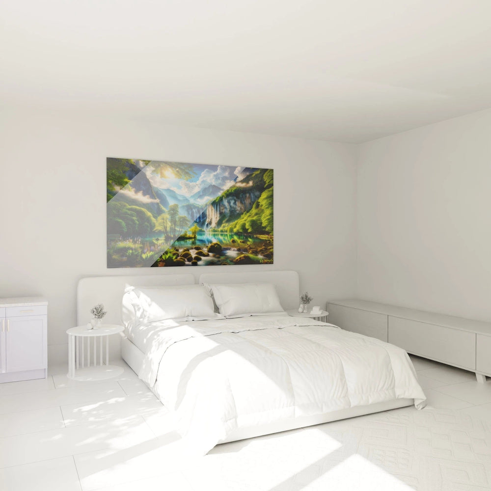 Chaque détail de cette œuvre évoque la pureté d’un paysage préservé : la fluidité des eaux scintillantes, la verdure vibrante des vallées et la danse lumineuse entre ombre et lumière qui crée une profondeur fascinante. En exposant ce tableau dans votre intérieur, vous invitez une atmosphère d’harmonie et de calme qui transforme l’espace en un sanctuaire de paix.