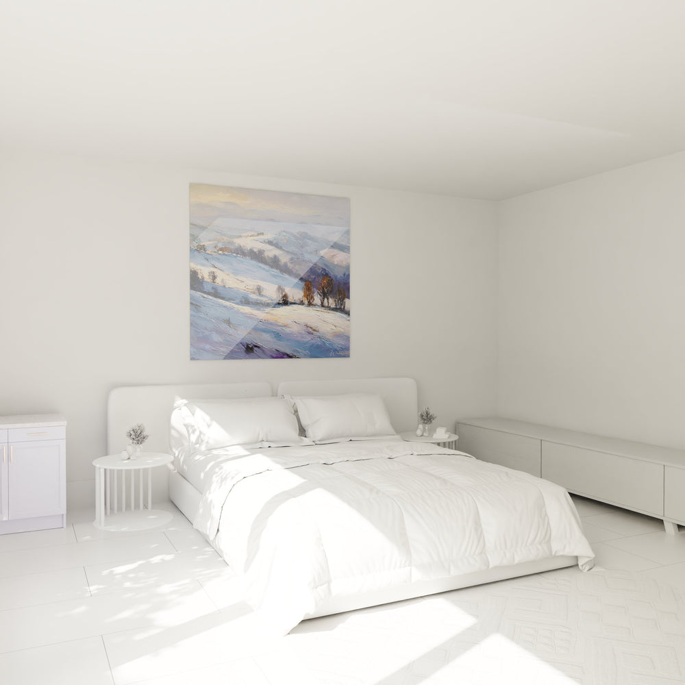 Ce tableau mural paysage enneigé capture la beauté sereine d'un paysage d'hiver dans une lumière dorée exceptionnelle. L'œuvre présente des collines enneigées qui s'étendent à perte de vue, créant un relief ondulant d'une grande poésie. La technique de peinture à l'huile révèle des tons dorés et bleus qui se mélangent harmonieusement, évoquant les derniers rayons du soleil couchant sur la neige immaculée. Les arbres nus aux branches cuivrées ponctuent le paysage, créant des points d'ancrage visuels qui structurent la composition. Ce tableau décoratif hiver se distingue par sa palette chromatique subtile, où les nuances de bleu froid contrastent avec les reflets chauds dorés qui illuminent certaines zones de neige. La texture visible des coups de pinceau apporte une dimension tactile à l'ensemble, caractéristique de la peinture impressionniste moderne. L'artiste a su saisir cette atmosphère hivernale paisible où règne un silence presque palpable, invitant le spectateur à la contemplation et à l'évasion dans cet univers enneigé enchanteur.