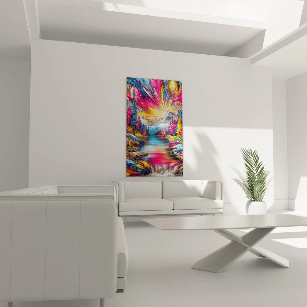 Ce tableau mural paysage fantastique présente une scène époustouflante où la nature se mélange à l'imaginaire cosmique. Au centre de cette œuvre d'art moderne, une explosion de lumière aux teintes dorées et blanches irradie vers l'extérieur, créant des volutes colorées qui dansent dans un ciel psychédélique. Le tableau décoratif coloré révèle un paysage aquatique où se reflètent toutes les nuances du spectre chromatique, des roses fuchsia aux bleus océan, en passant par des jaunes solaires éclatants. Les arbres stylisés qui bordent cette rivière fantastique semblent vibrer d'une énergie surnaturelle, leurs feuillages adoptant des couleurs impossibles dans la réalité. Cette décoration murale artistique transforme l'espace en fenêtre vers un monde imaginaire où les lois de la physique laissent place à la pure créativité. Les reflets dans l'eau ondulent en bandes horizontales multicolores, créant un effet hypnotique qui attire le regard. Ce tableau contemporain abstrait mélange habilement réalisme et surréalisme, offrant une interprétation unique de la beauté naturelle sublimée par l'art digital. L'art mural design révèle des détails fascinants à chaque observation, invitant à la contemplation et à l'évasion mentale.