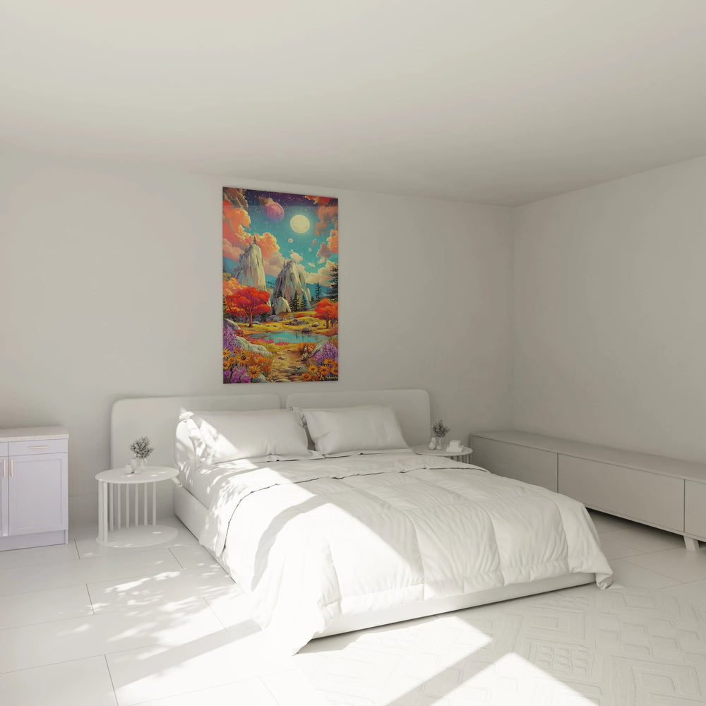 Ce tableau mural paysage fantastique présente une scène extraordinaire où deux astres célestes illuminent une vallée enchantée. La composition révèle des montagnes rocheuses stylisées aux tons gris-verts qui s'élèvent majestueusement vers un ciel étoilé. Au premier plan, une végétation luxuriante aux couleurs vives explose en nuances orangées, rouges et violettes, créant un contraste saisissant avec les formations géologiques. Un petit cours d'eau serpente à travers cette illustration style bande dessinée nature, reflétant les teintes du ciel fantastique. Les nuages aux formes organiques, teintés de rose et d'orange, ajoutent une dimension onirique à cette œuvre d'art murale science-fiction. La technique artistique rappelle l'univers de la bande dessinée européenne avec ses traits précis et ses couleurs saturées. Cette décoration murale paysage imaginaire transforme n'importe quel espace en portail vers un monde parallèle. Le style graphique sophistiqué mélange réalisme et fantaisie pour créer une ambiance visuelle captivante qui invite à l'évasion et à la contemplation d'un univers où la nature terrestre côtoie des éléments cosmiques extraordinaires.