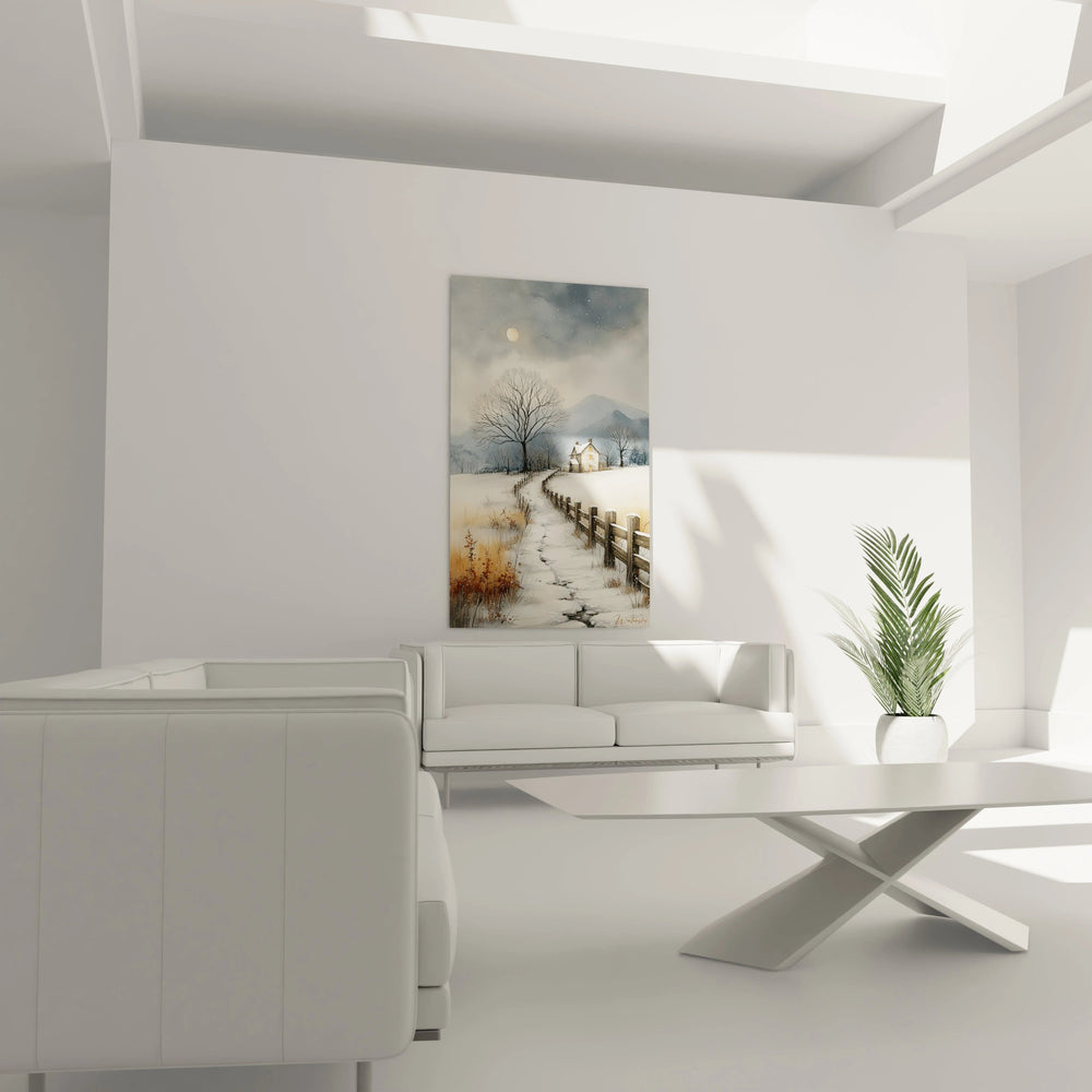 Ce tableau paysage hivernal révèle une scène campagnarde d'une beauté saisissante, où la neige recouvre délicatement un sentier serpentant vers une chaumière de pierre. L'œuvre présente un tableau paysage neige maison d'une remarquable authenticité, capturant l'essence même de l'hiver rural. La composition harmonieuse guide naturellement le regard du premier plan vers l'habitation éclairée, créant une profondeur visuelle exceptionnelle. Les fenêtres dorées de la demeure contrastent magnifiquement avec la palette froide dominante, apportant une note chaleureuse à cette décoration murale paysage hiver. Cette œuvre incarne parfaitement l'atmosphère contemplative des soirs d'hiver, où le temps semble suspendu dans un silence cristallin.