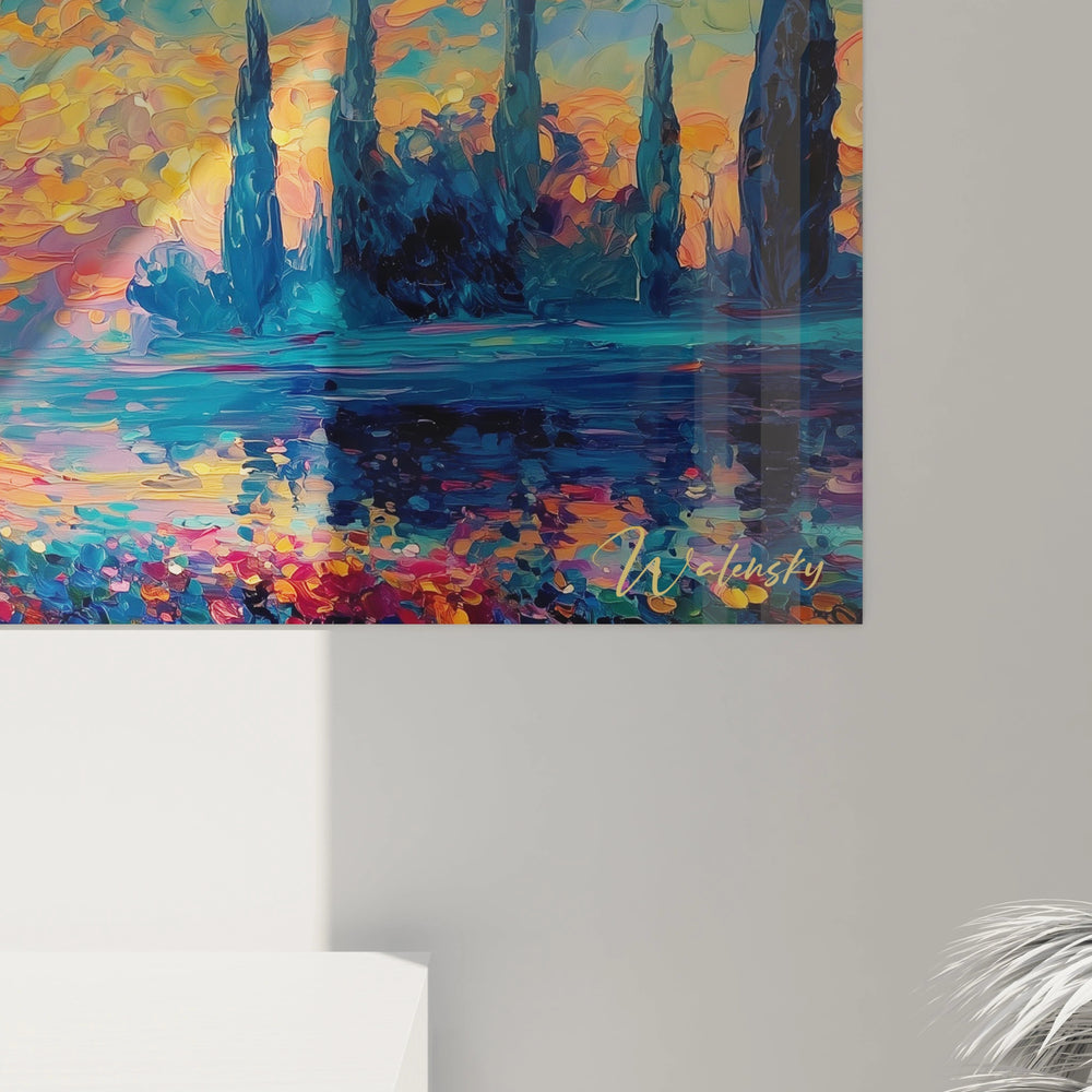 La composition de cette œuvre révèle un équilibre parfait entre les éléments terrestres et célestes. L'arbre imposant situé sur la gauche du cadre agit comme un ancrage visuel puissant, ses branches sombres contrastant avec l'embrasement du ciel. La ligne d'horizon, positionnée dans le tiers inférieur de l'œuvre, suit la règle des tiers et guide naturellement le regard vers le point focal central. Les cyprès élancés sur la droite créent une verticalité qui équilibre la masse horizontale du lac. Cette tableau paysage reflets aquatiques utilise la perspective atmosphérique pour créer une profondeur saisissante, où chaque plan s'estompe progressivement vers l'horizon.