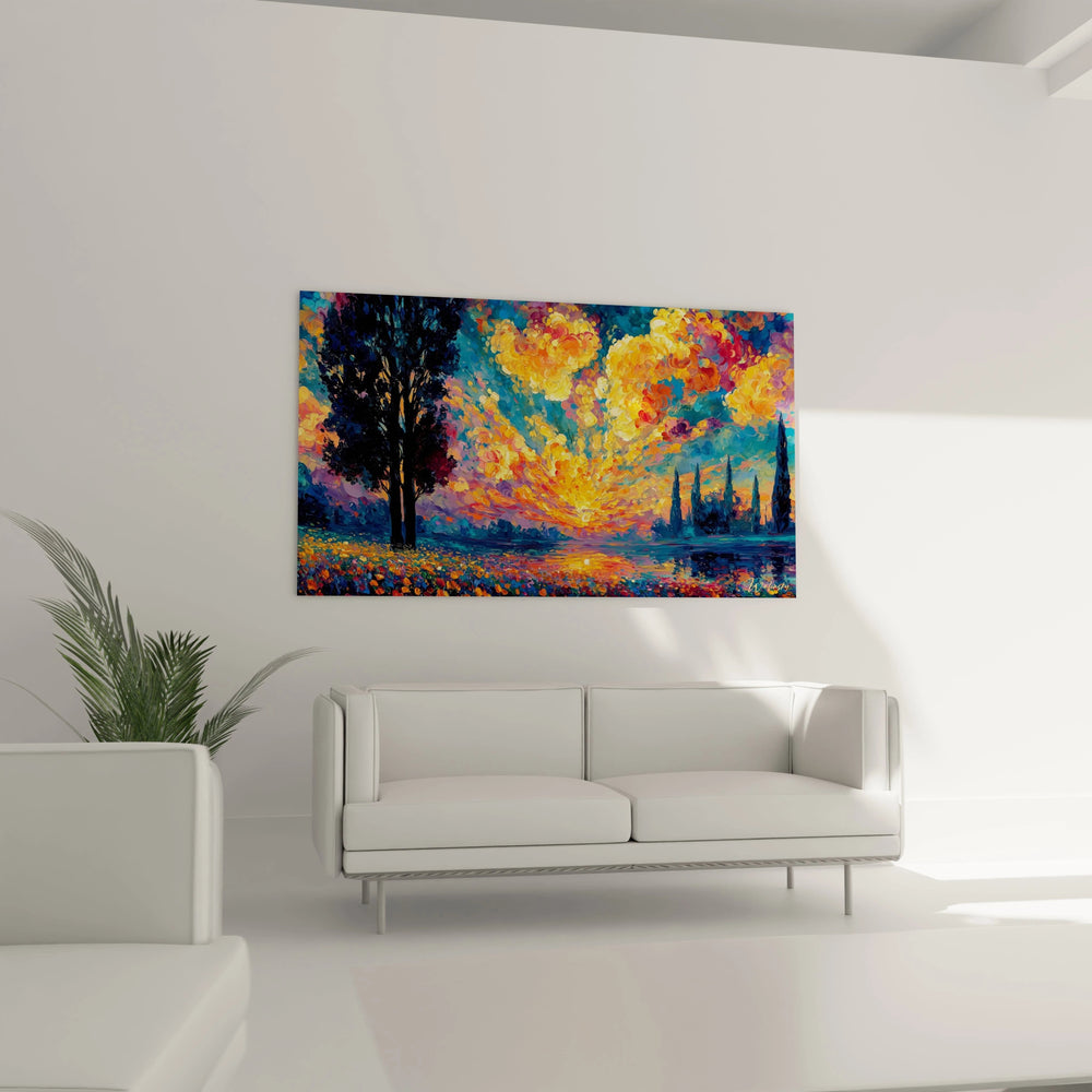 Cette œuvre se distingue par plusieurs caractéristiques visuelles impossibles à dupliquer. La formation nuageuse exceptionnelle présente des volutes sculpturales qui évoquent une architecture céleste en perpétuel mouvement. Les reflets aquatiques ne sont pas de simples duplications inversées mais révèlent une interprétation artistique subtile où les couleurs se mélangent et se transforment. L'arbre principal, avec sa ramure complexe et sa silhouette imposante, crée un contrepoint dramatique unique. Cette décoration murale paysage dramatique possède une signature visuelle distinctive dans la façon dont les tons orangés semblent littéralement irradier depuis le centre de la composition, créant un effet de rayonnement centrifuge saisissant.